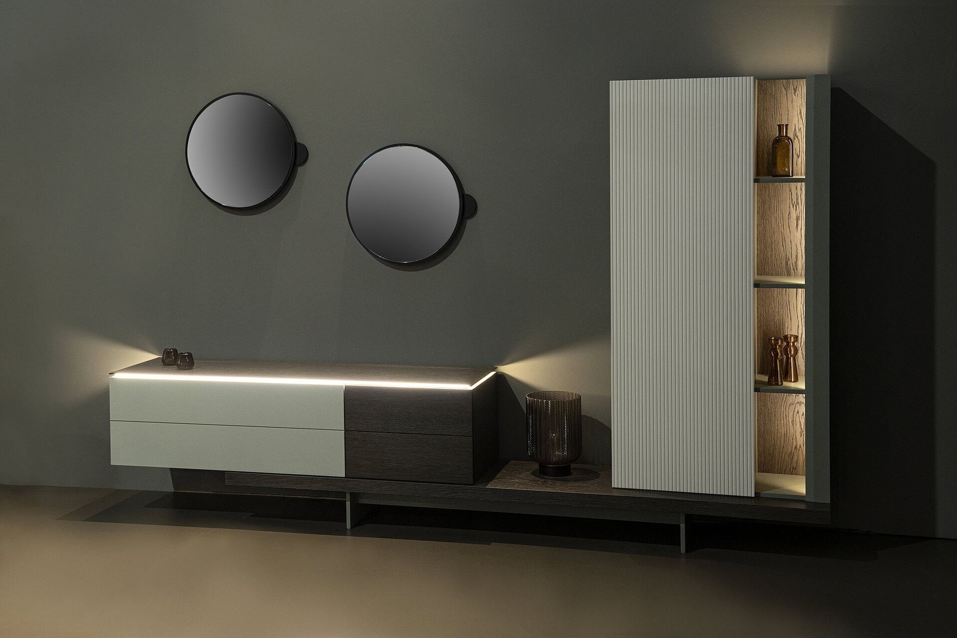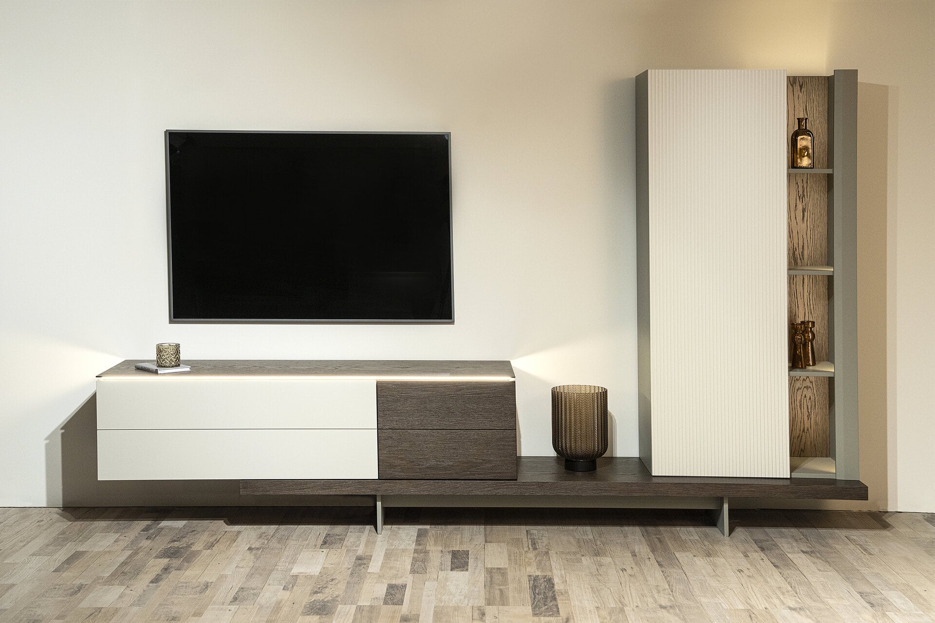 Σύνθεση Tender. Ελληνικής κατασκευής. Ξύλο: Δρυς σε συνδυασμό με ματ λάκα Διάσταση: 275cm x 45cm x 170cm Έπιπλο tv: 150cm x 44cm x 38cm Ντουλάπι με ραφιέρα: 75cm x 35cm x 150cm Βάση: 225cm x 45cm x 20cm Extra: φωτισμός με διακόπτη στo έπιπλο tv με κόστος 300€ Δυνατότητα αλλαγών.