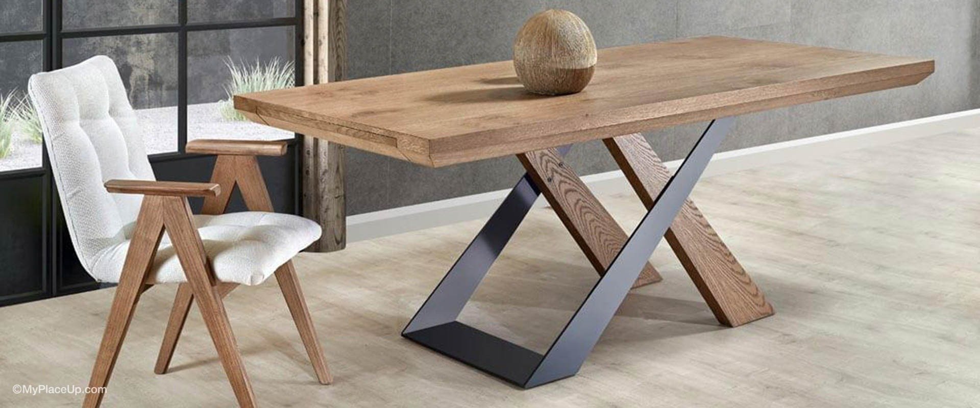 Δρύινη τραπεζαρία με μεταλλική βάση. Δυνατότητα επιλογής χρώματος ξύλου και ηλεκτροστατικής βαφής στο μέταλλο. O συνδυασμός του ξύλου με το μέταλλο προσδίδουν απλότητα, ζεστασιά και διαχρονικότητα στη διακόσμησή σας.