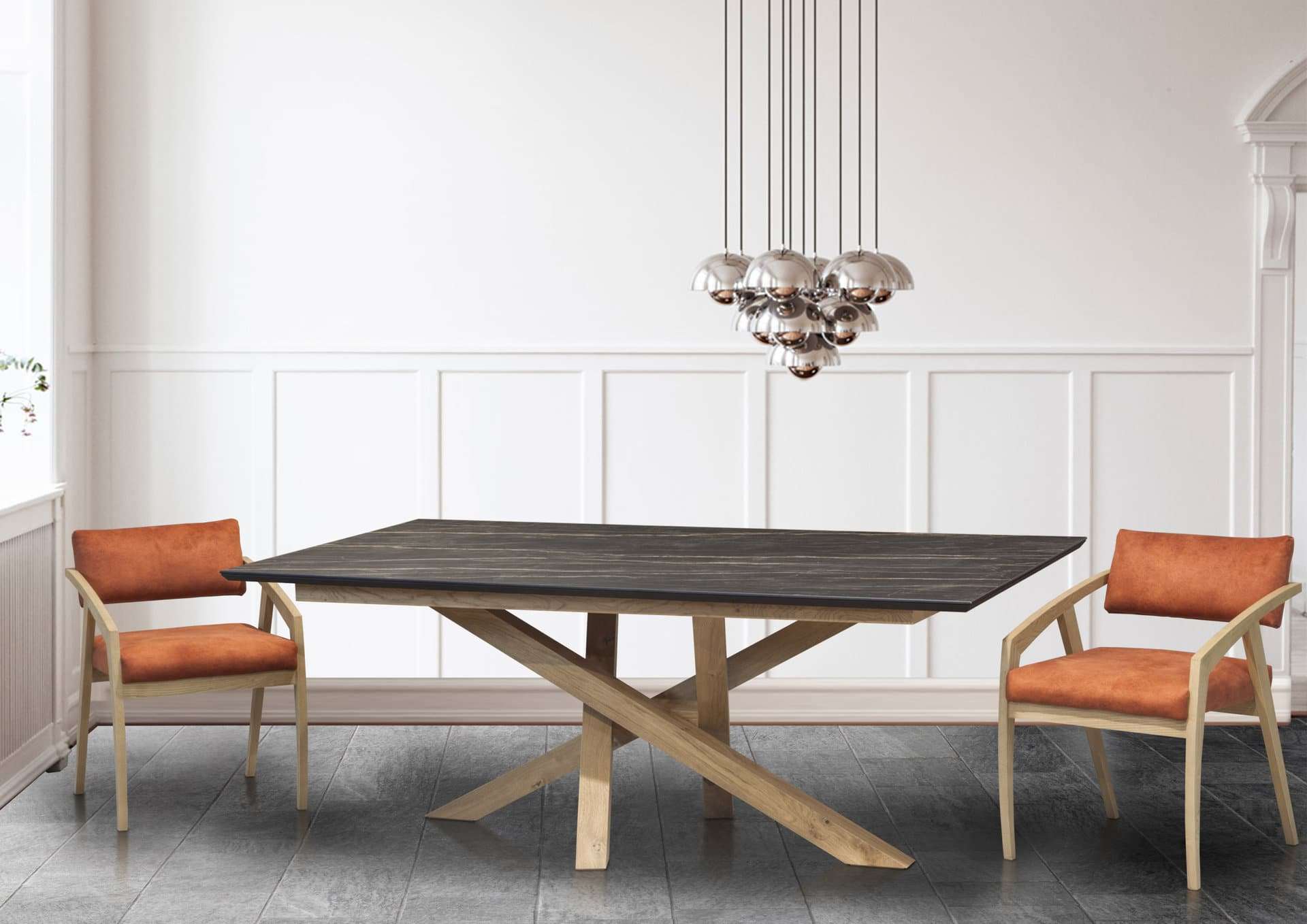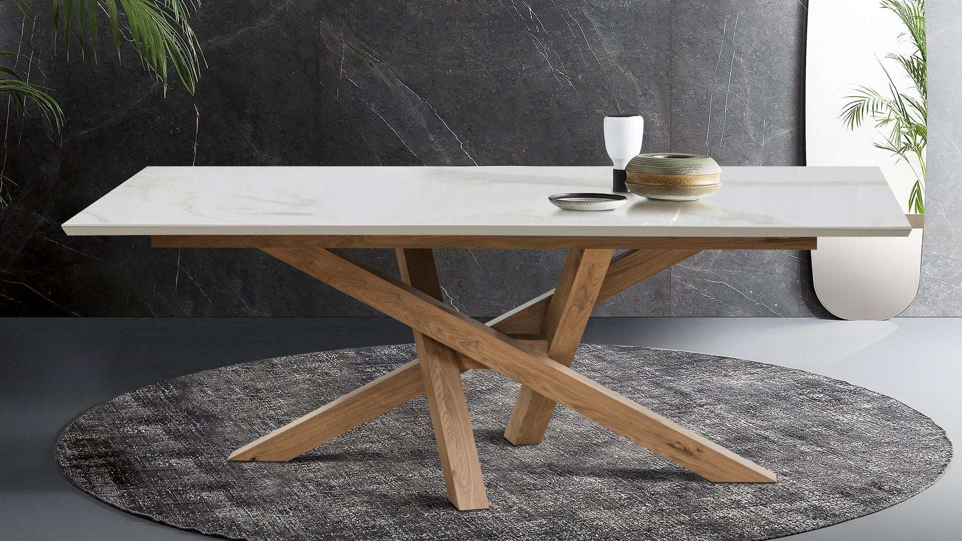 Κεραμική τραπεζαρία με κεντρική ξύλινη βάση στα χρώματα τις επιλογής σας. Κεραμική επιφάνεια σε ματ και γυαλιστερές αποχρώσεις. Η τραπεζαρία Cross Stone έχει μηχανισμό προέκτασης 45cm.  Την κατασκευάζουμε σε διαστάσεις και χρώματα της αρεσκείας σας.