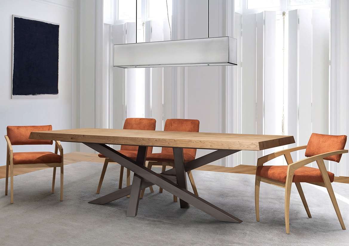 Μοντέρνα τραπεζαρία με ιδιαίτερη βάση βαμμένη με λάκα σε χρώματα τις επιλογής σας. Η τραπεζαρία Cross έχει ενσωματωμένο μηχανισμό προέκτασης 45cm. Την κατασκευάζουμε σε διαστάσεις, ξύλο και χρώματα προσαρμοσμένα στο χώρο σας.
