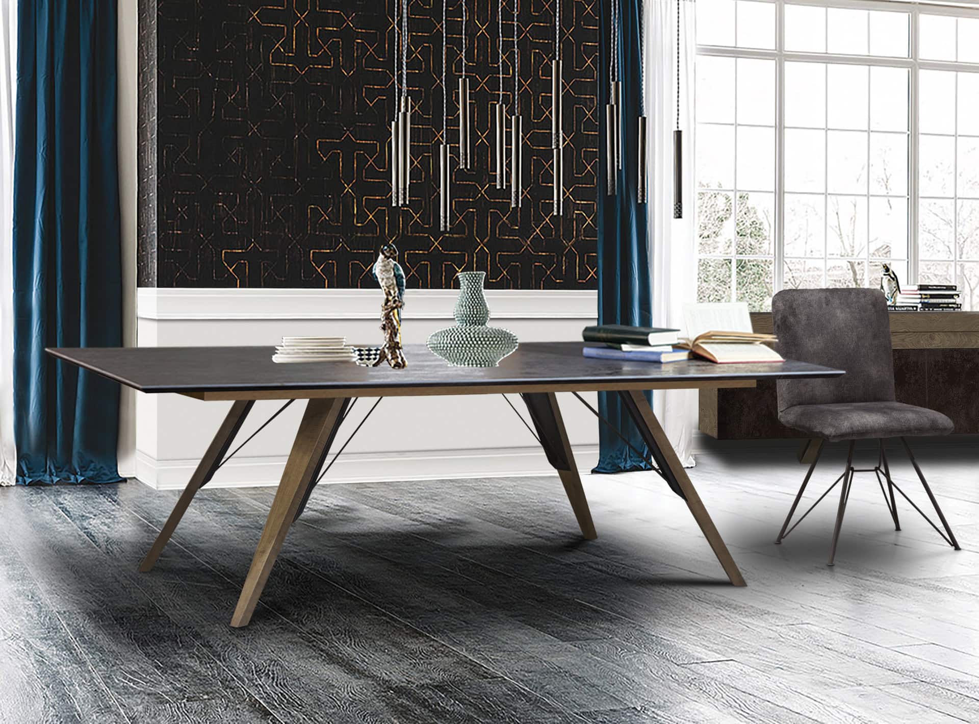 Κεραμική τραπεζαρία με ξύλινα πόδια και μεταλλικές λεπτομέρειες. Κεραμική επιφάνεια σε ματ και γυαλιστερές αποχρώσεις. Η τραπεζαρία Dieci διαθέτει προέκταση 45cm. Την κατασκευάζουμε σε διαστάσεις και χρώματα της αρεσκείας σας.