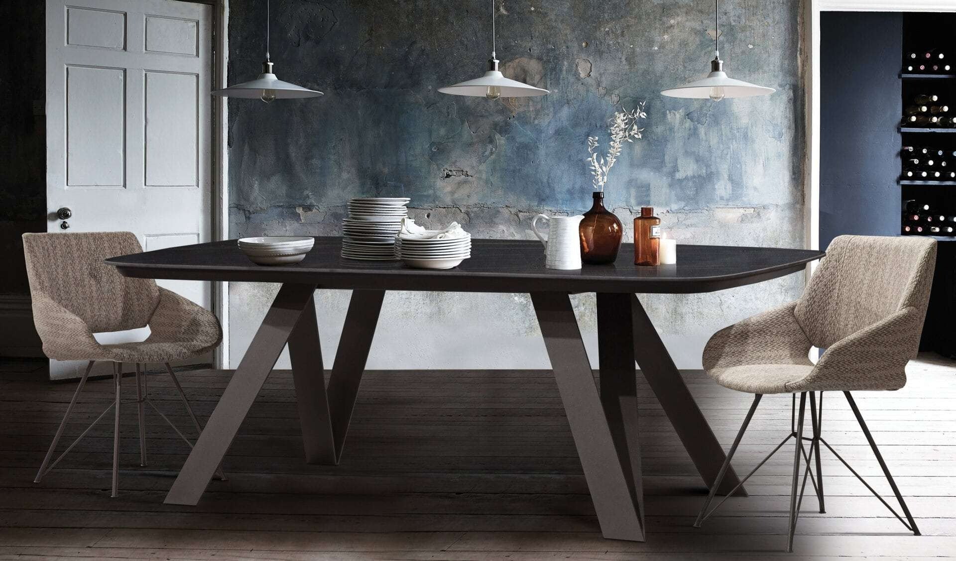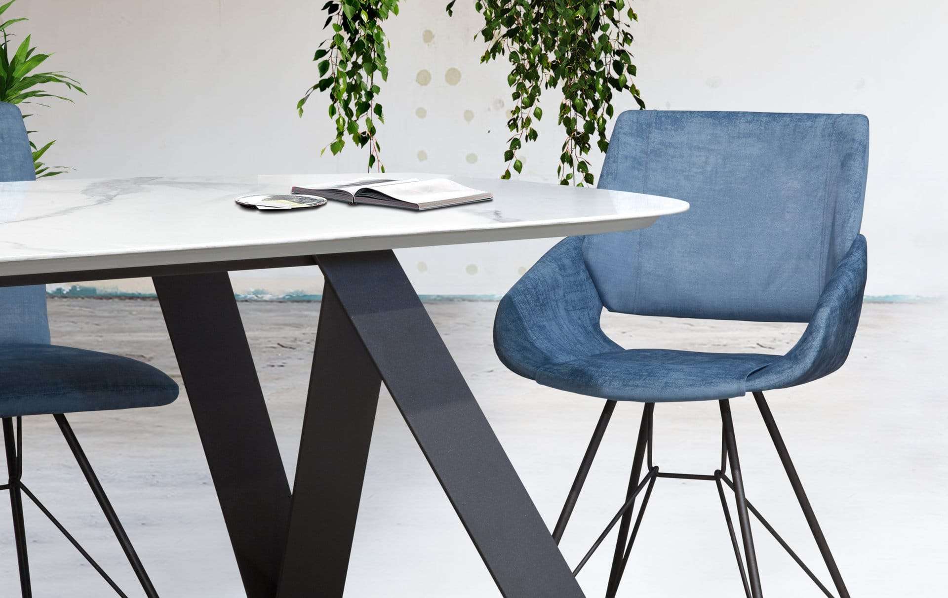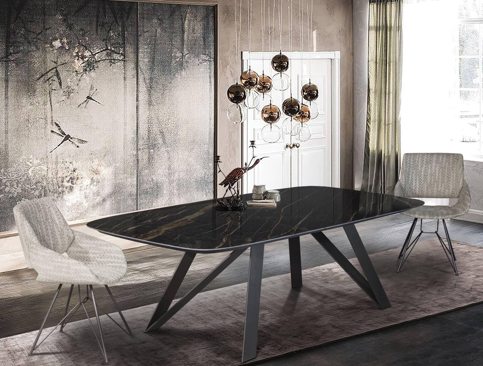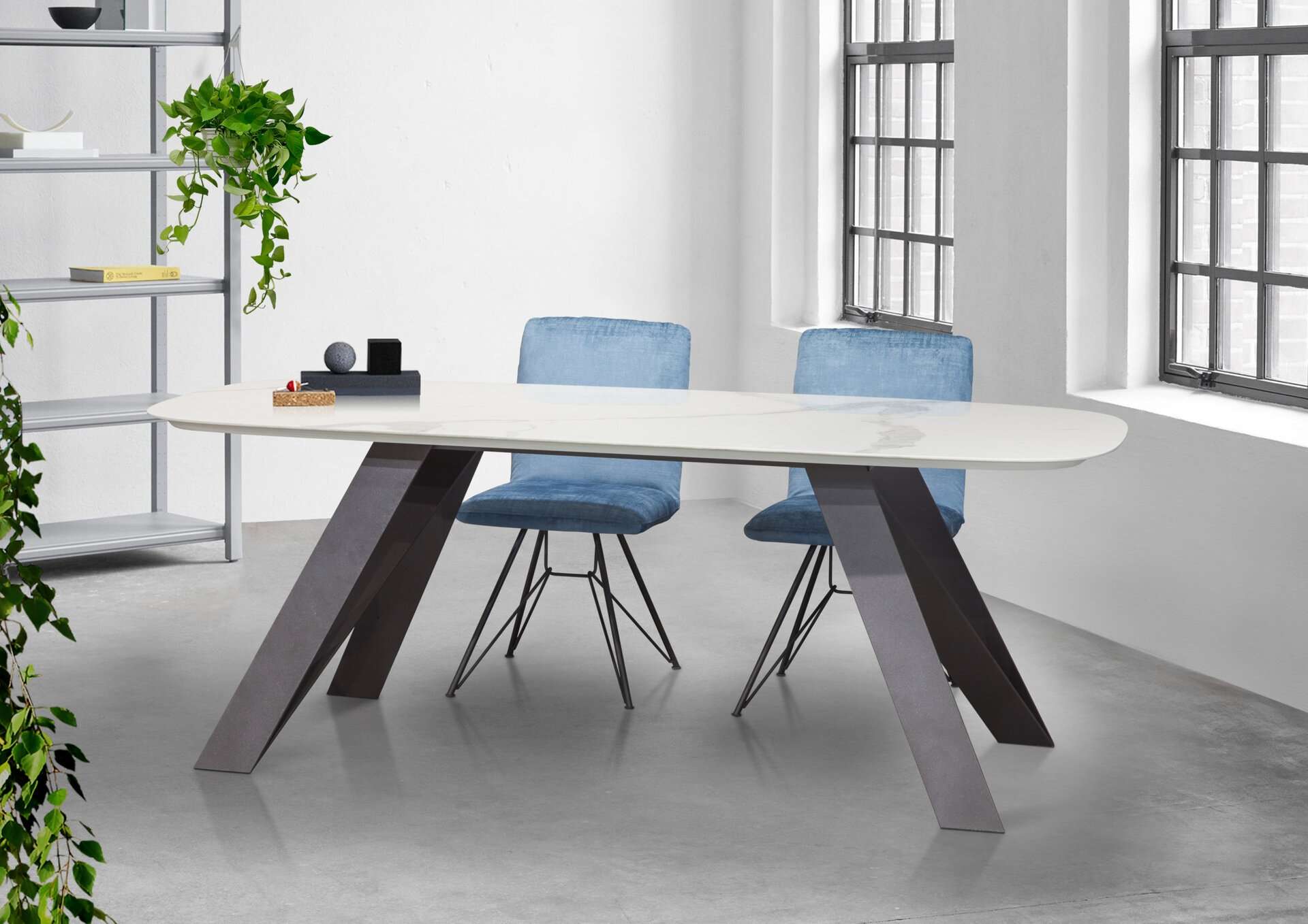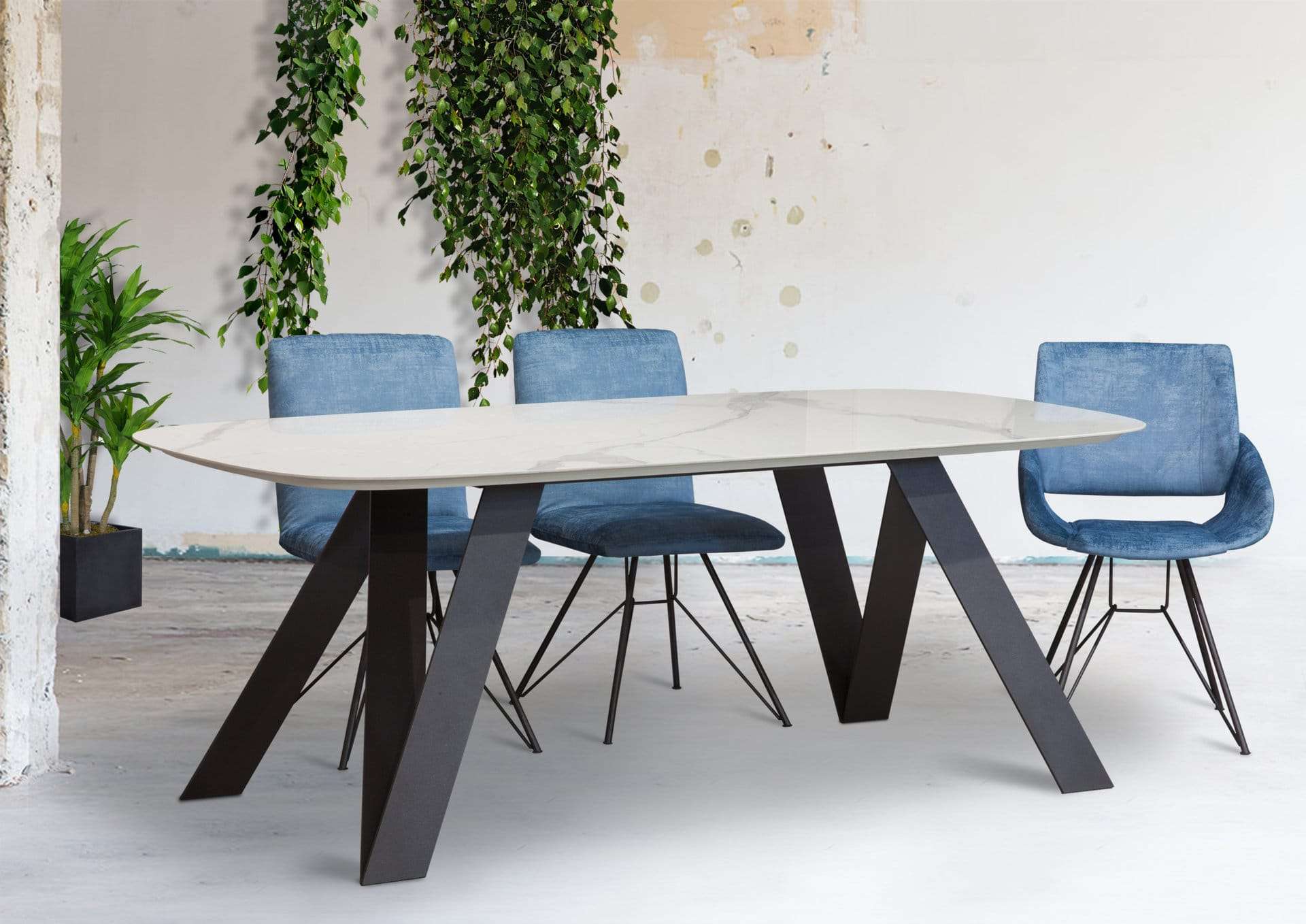 Κεραμική τραπεζαρία με κεντρική μεταλλική βάση με ηλεκτροστατική βαφή. Κεραμική επιφάνεια σε ματ και γυαλιστερές αποχρώσεις. Η τραπεζαρία Double N έχει ιδιαίτερο σχεδιασμό στη βάση που θα ενθουσιάσει. Την κατασκευάζουμε σε διαστάσεις και χρώματα της επιλογής σας.