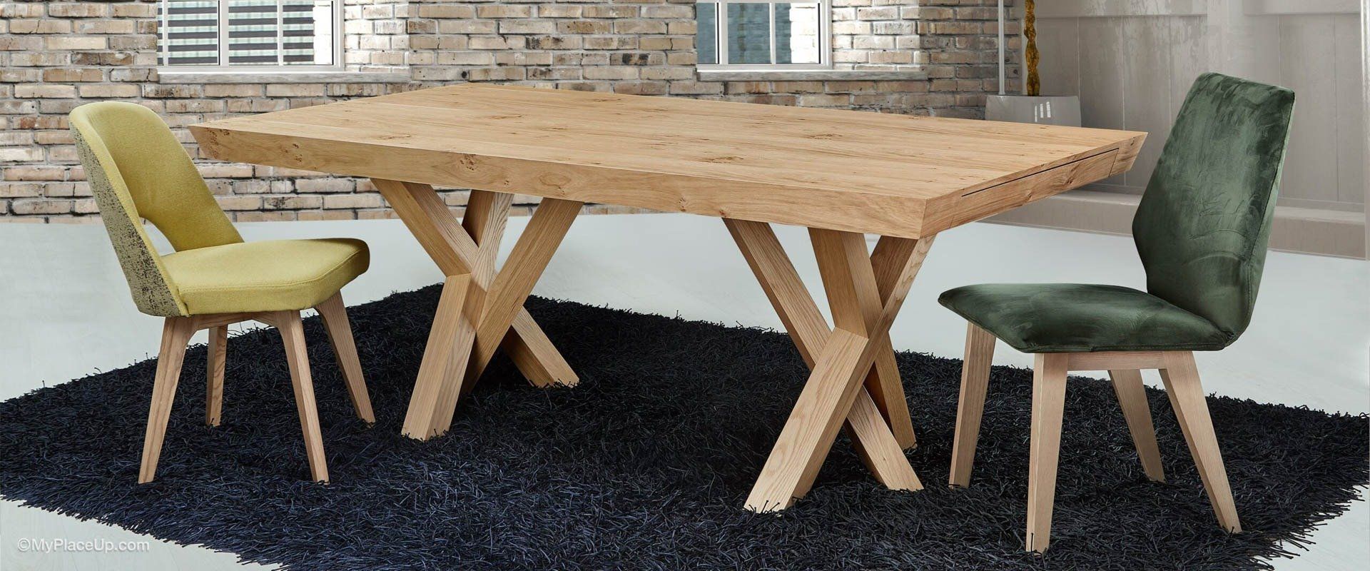 Η τραπεζαρία Dream από ποιοτικό φυσικό ξύλο δρυός με ρόζους, προβάλλει διαφοροποιημένο deisgn που στηρίζεται κυρίως στα δύο επιβλητικά πόδια της, που είναι κατασκευασμένα από μασίφ ξύλo.