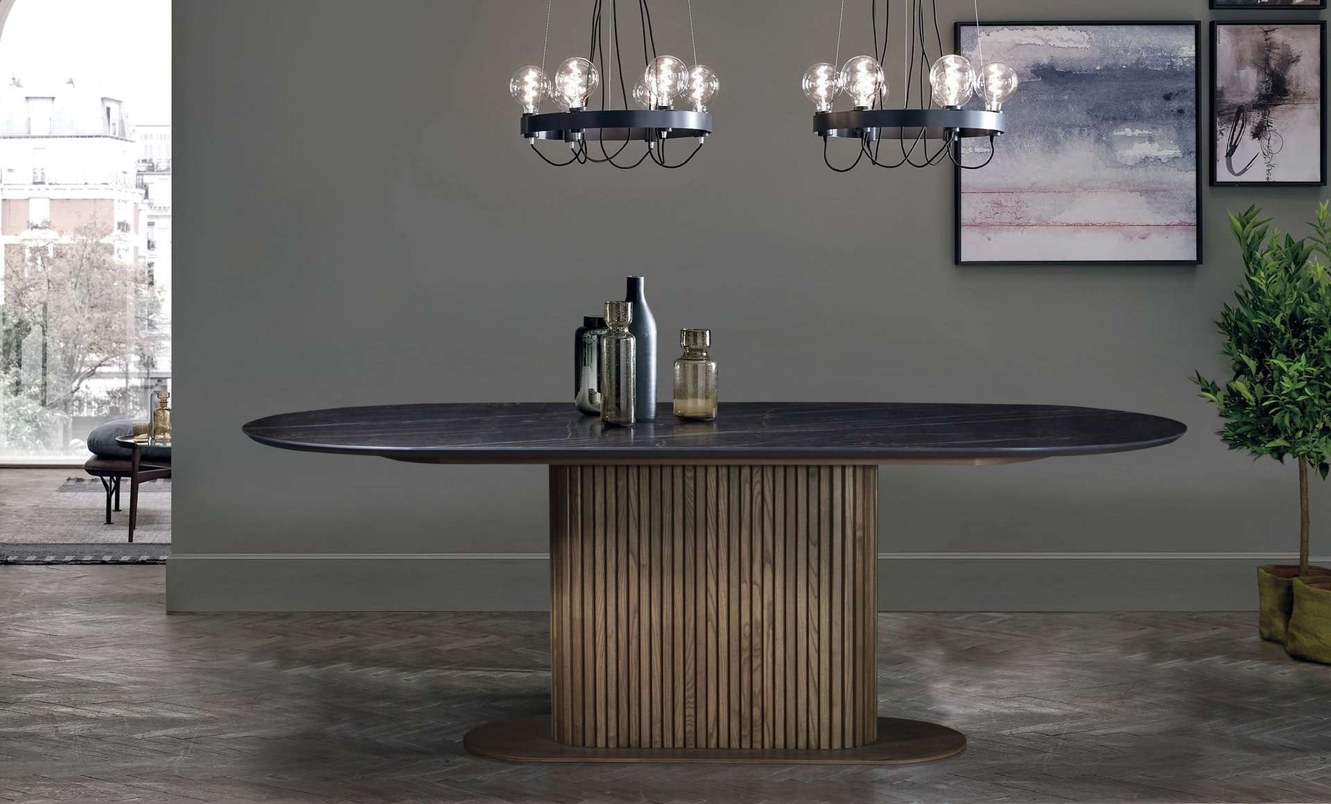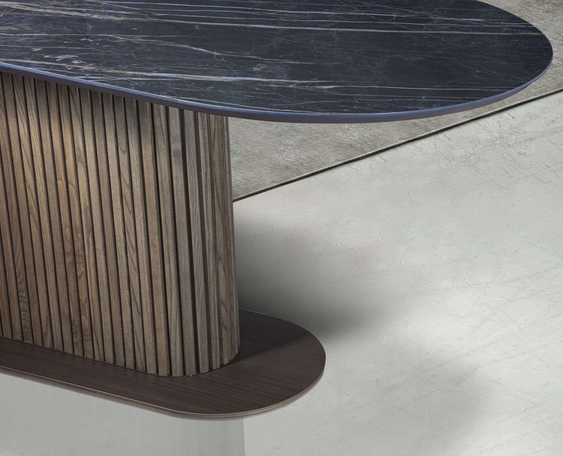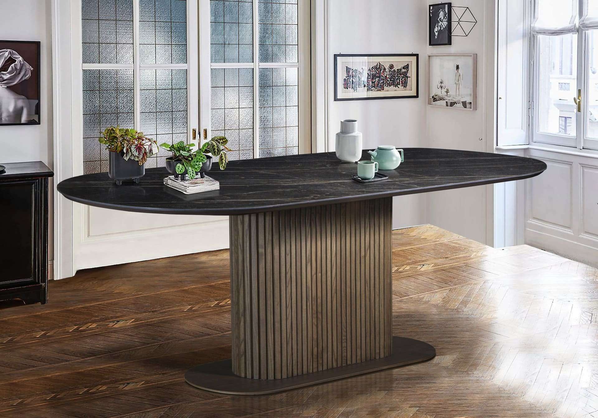 Κεραμική τραπεζαρία με κεντρικη ξύλινη βάση με εύκαμπτο μασίφ ξύλο δρυς. Κεραμική επιφάνεια σε ματ και γυαλιστερές αποχρώσεις. Την κατασκευάζουμε σε διαστάσεις και χρώματα της αρεσκείας σας.