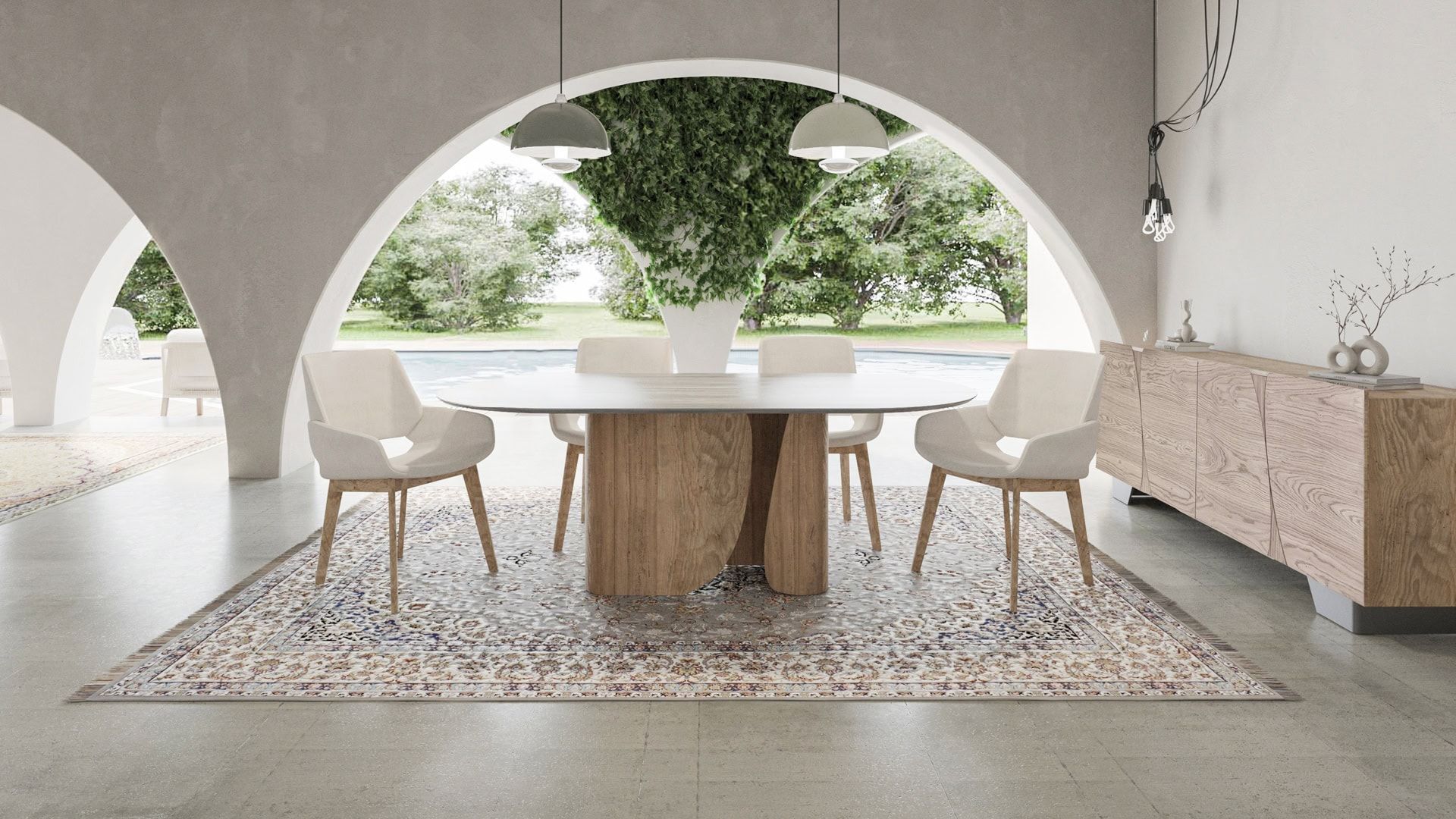 Τραπεζαρία με επιφάνεια ξύλου και κεντρική ξύλινη βάση στα χρώματα τις επιλογής σας. Την κατασκευάζουμε σε διαστάσεις και χρώματα της αρεσκείας σας.