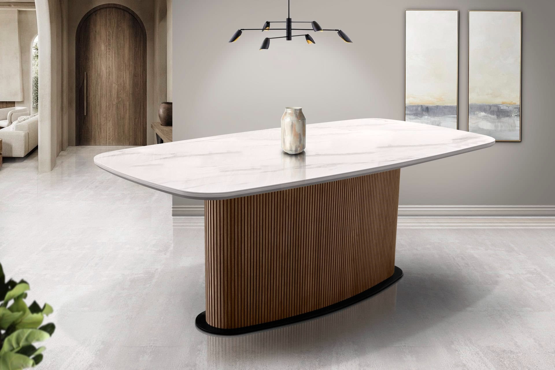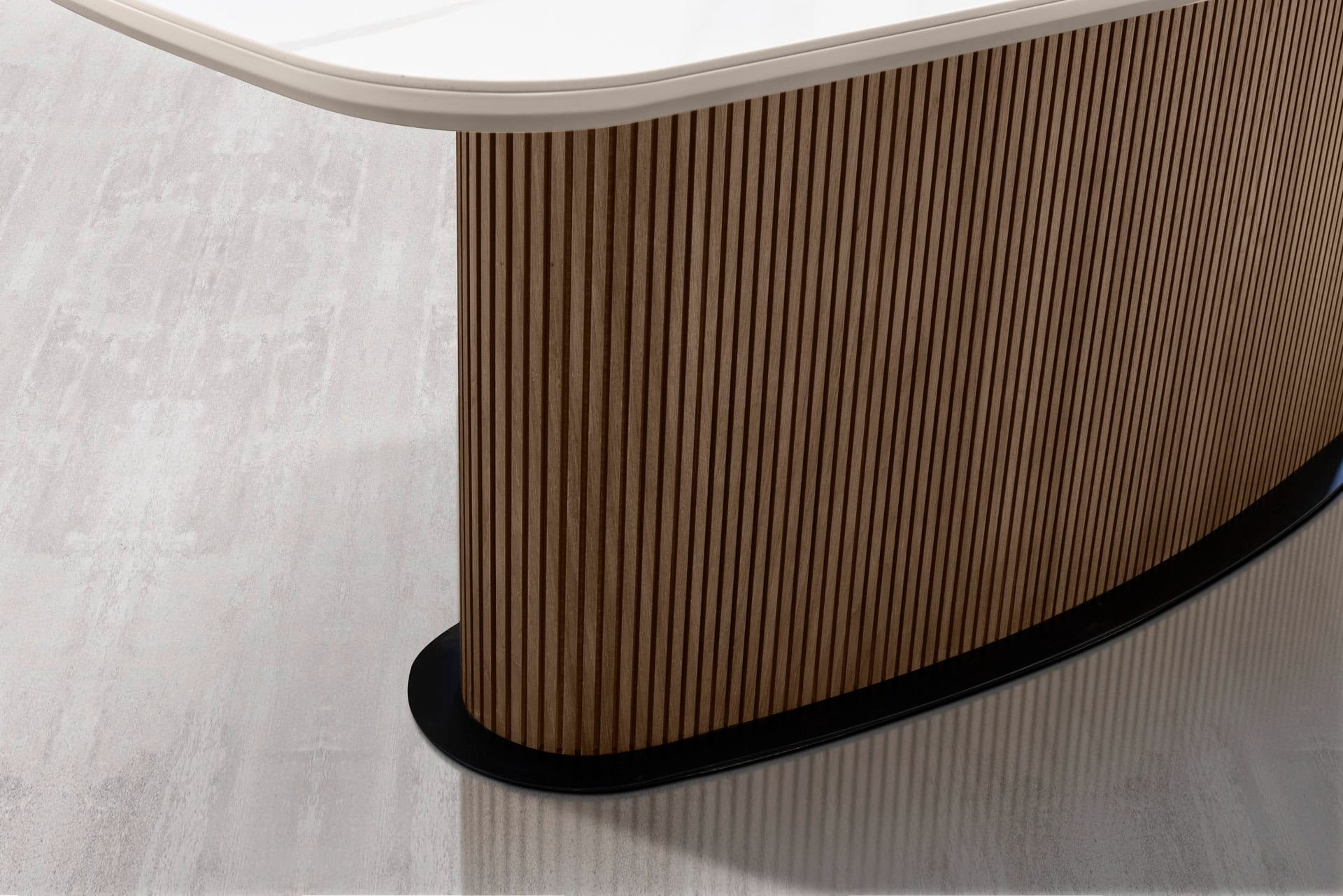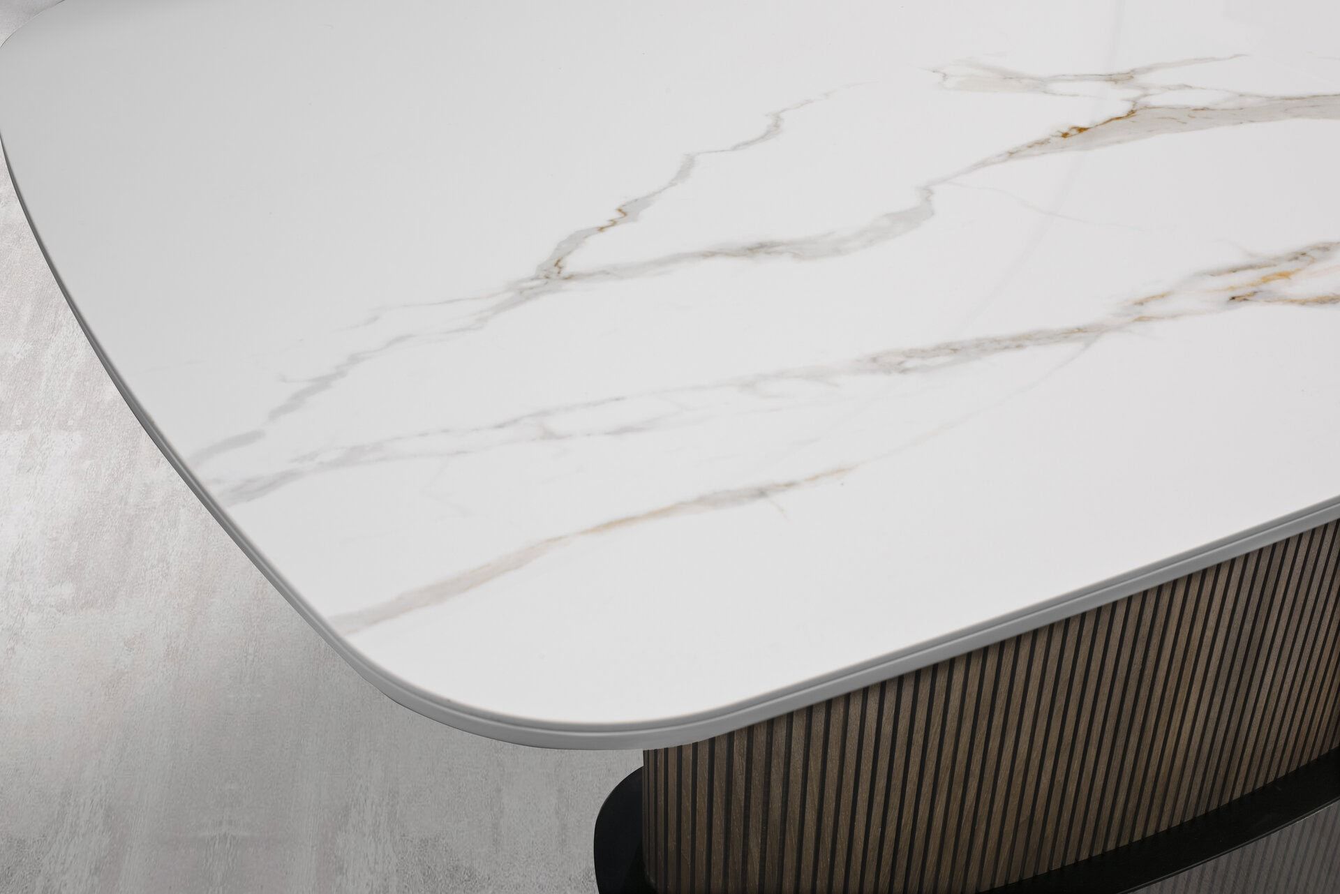 Μοντέρνα τραπεζαρία με ιδιαίτερη ξύλινη βάση με μασίφ πηχάκια σε χρώματα τις επιλογής σας. Η τραπεζαρία Τ18 έχει κεραμική επιφάνεια με επιλογή σε χρώμα και σχέδιο. Την κατασκευάζουμε σε διαστάσεις και χρώματα προσαρμοσμένα στο χώρο σας