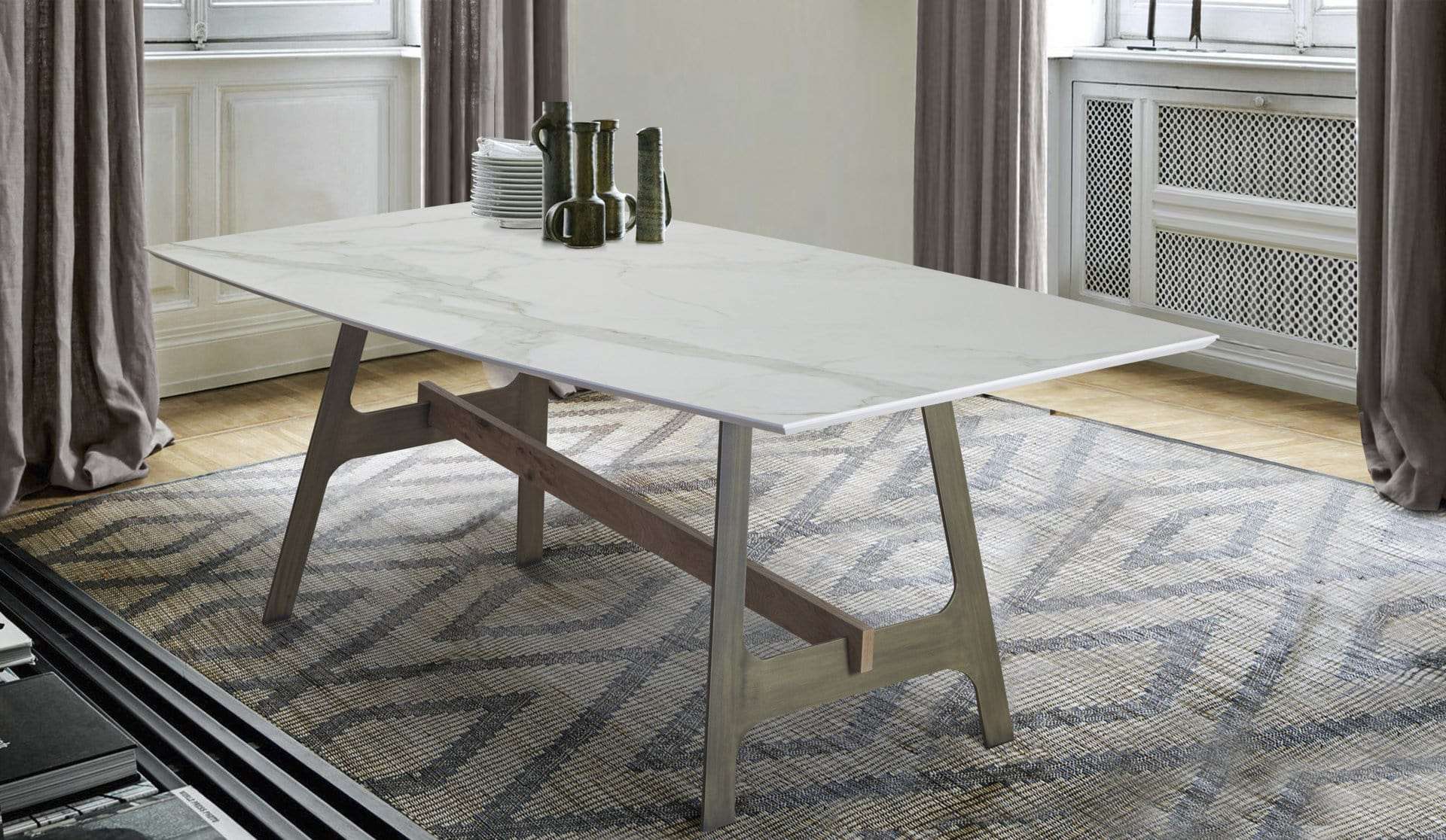 Μοντέρνα τραπεζαρία με κεραμική επιφάνεια σε αποχρώσεις ματ ή γυαλιστερή και ιδιαίτερη βάση κατασκευασμένη με μέταλλο και ξύλο. Την κατασκευάζουμε σε διαστάσεις, ξύλο και χρώματα της αρεσκείας σας.
