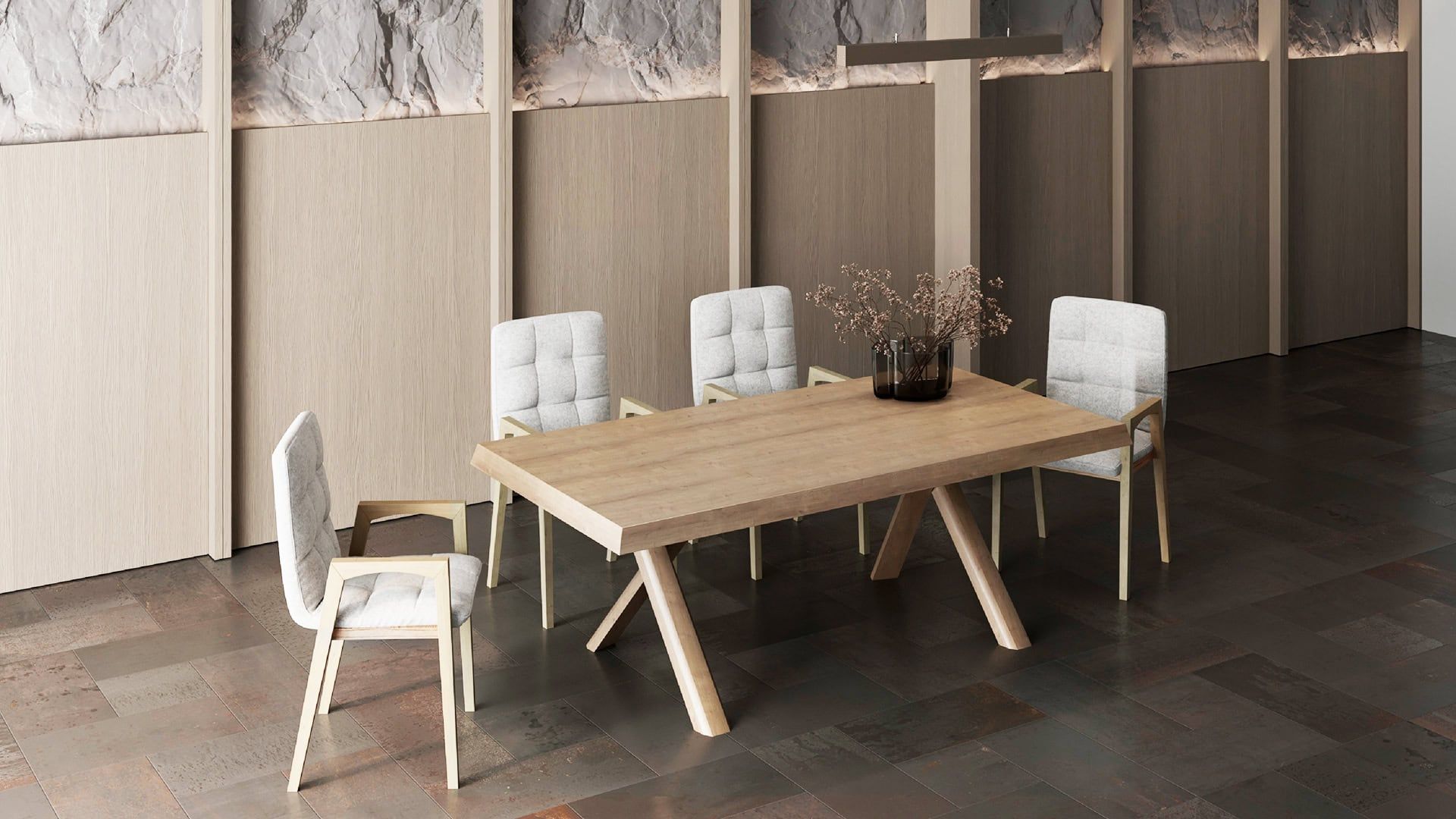 Μοντέρνα τραπεζαρία με χιαστή βάση σε μασίφ ξύλο στα χρώματα τις επιλογής σας. Η τραπεζαρία X-MASSIF έχει μηχανισμό προέκτασης 40cm. Την κατασκευάζουμε σε διαστάσεις, ξύλο και χρώματα της αρεσκείας σας.
