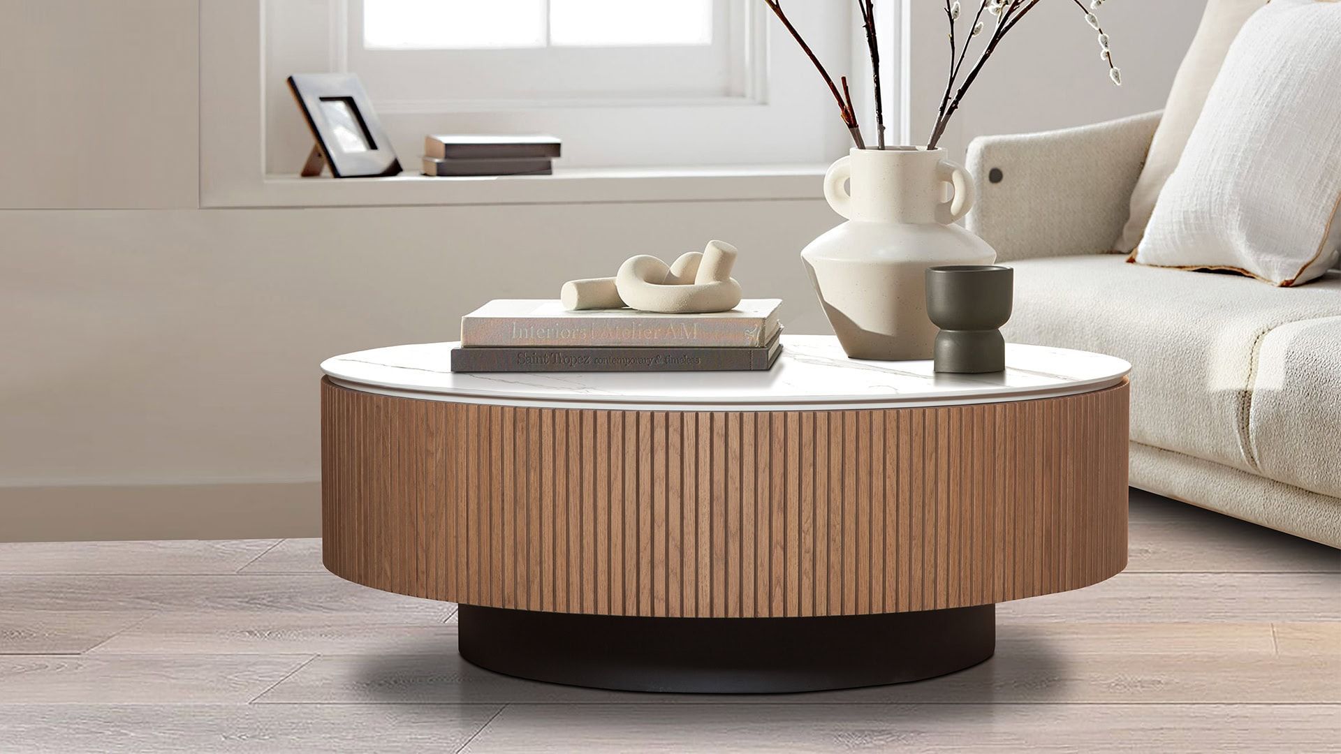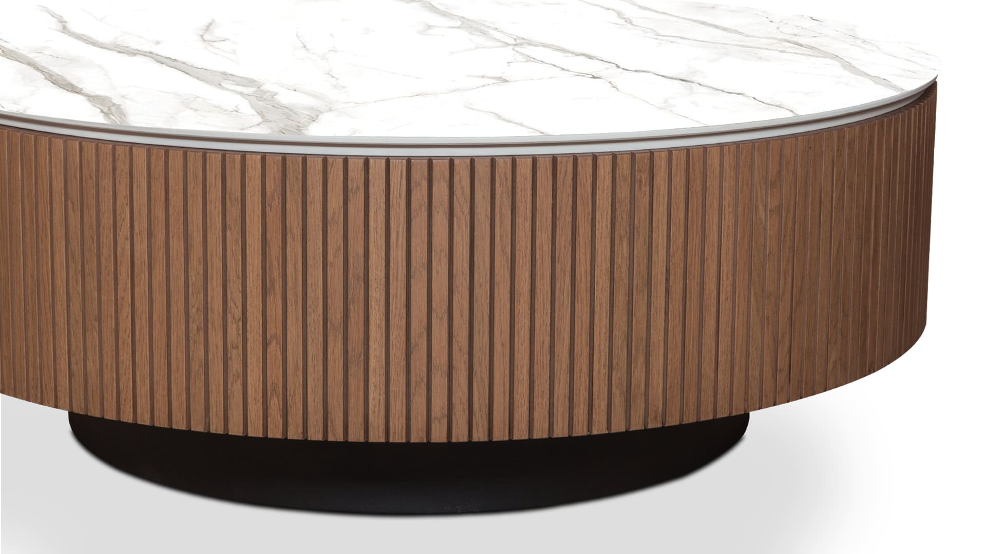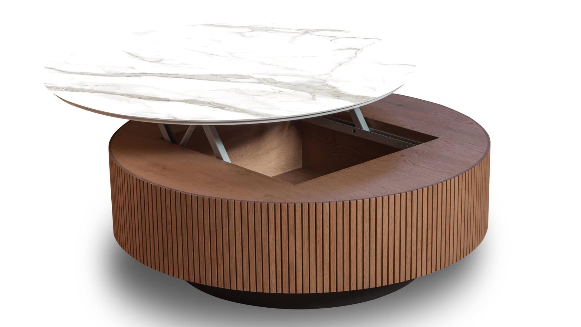 Το στρογγυλό τραπεζάκι σαλονιού Cyclo συνδυάζει την κομψότητα της κεραμικής επιφάνειας με τη ζεστασιά του panel δρυς, δημιουργώντας ένα μοναδικό αισθητικό αποτέλεσμα που τραβάει τα βλέμματα. Ο πρακτικός μηχανισμός τύπου σερβιτόρου προσφέρει ευελιξία και εργονομία, καθιστώντας το Cyclo την ιδανική επιλογή για μοντέρνα σαλόνια που απαιτούν τόσο λειτουργικότητα όσο και υψηλή αισθητική.
