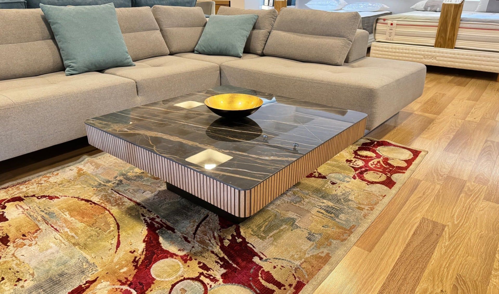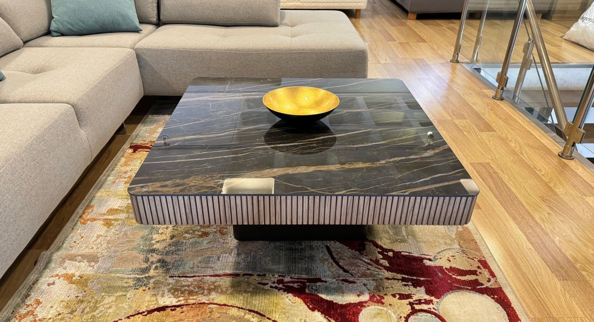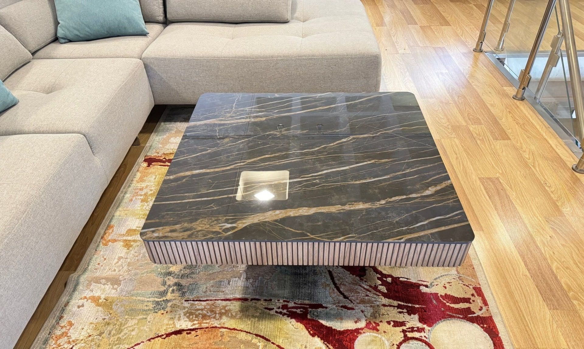 Τραπεζάκι σαλονιού με κεραμική επιφάνεια και φυσικό ξύλο δρυς. Έυκαμπτο μασίφ περιμετρικά με ξύλο δρυός.