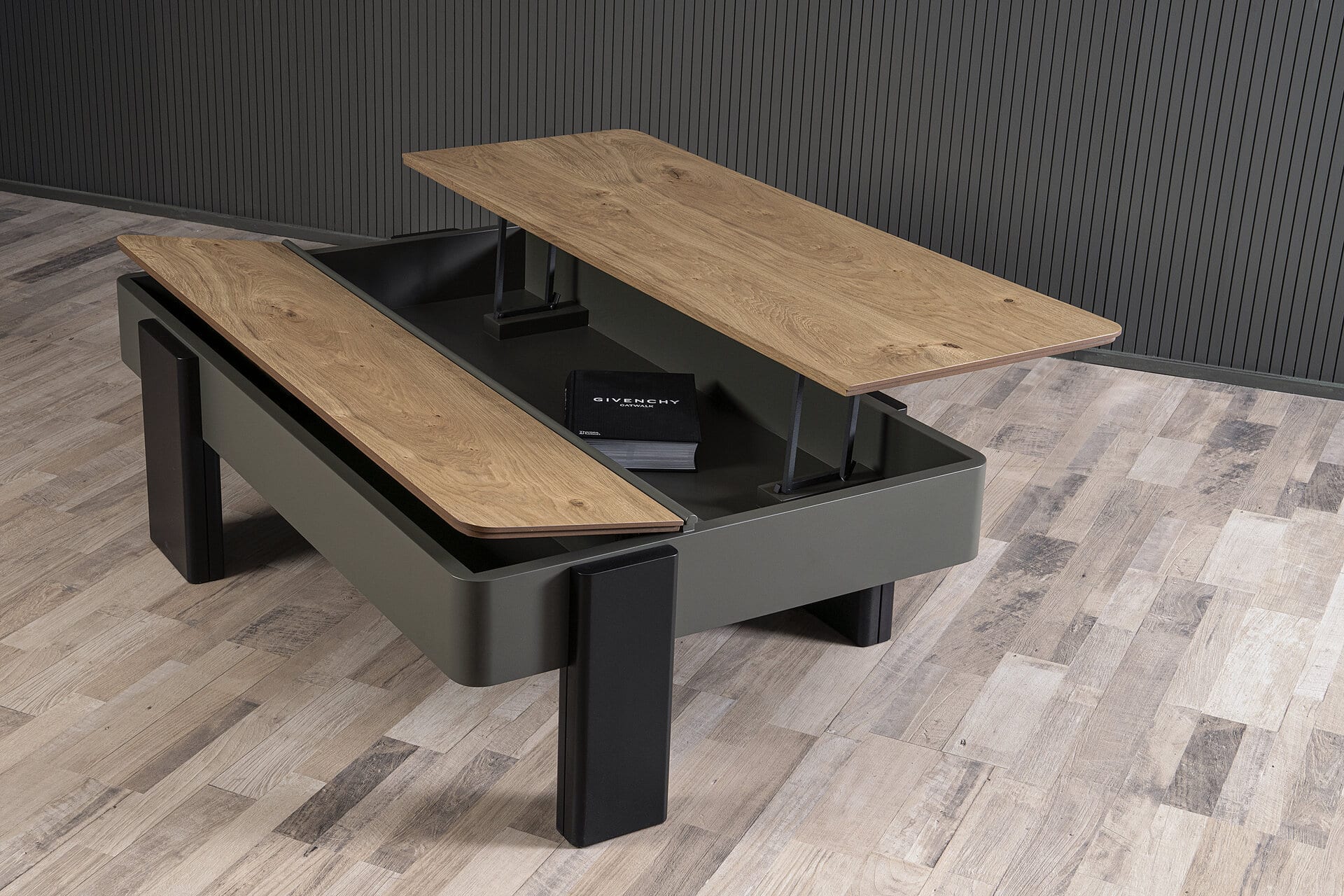 Ένα παραλληλόγραμμό τραπεζάκι σαλονιού loft σε rustic ξύλο. Διαθέτει σερβιτόρο και ντουλάπι, που εξυπηρετεί τις ανάγκες αποθήκευσης.