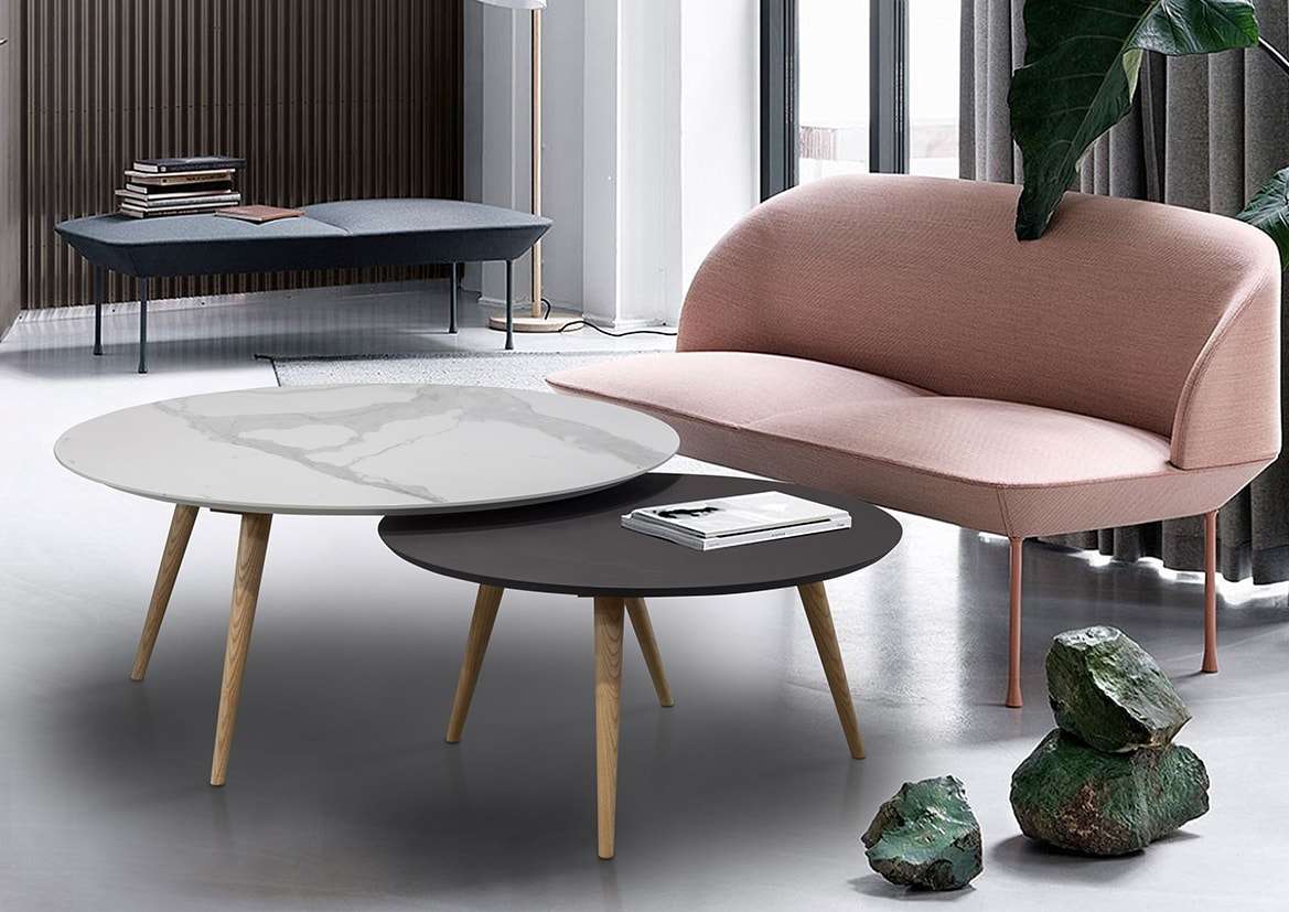 Τραπεζάκια σαλονιού σε ένα όμορφο και λειτουργικό σετ. Τα χωρίζεις ανάλογα με τις ανάγκες κάθε στιγμής. Ένα τραπεζάκι με κεραμική επιφάνεια και ένα με τεχνοτροπία. Ξύλινα πόδια, σε χρώματα της επιλογής σας.