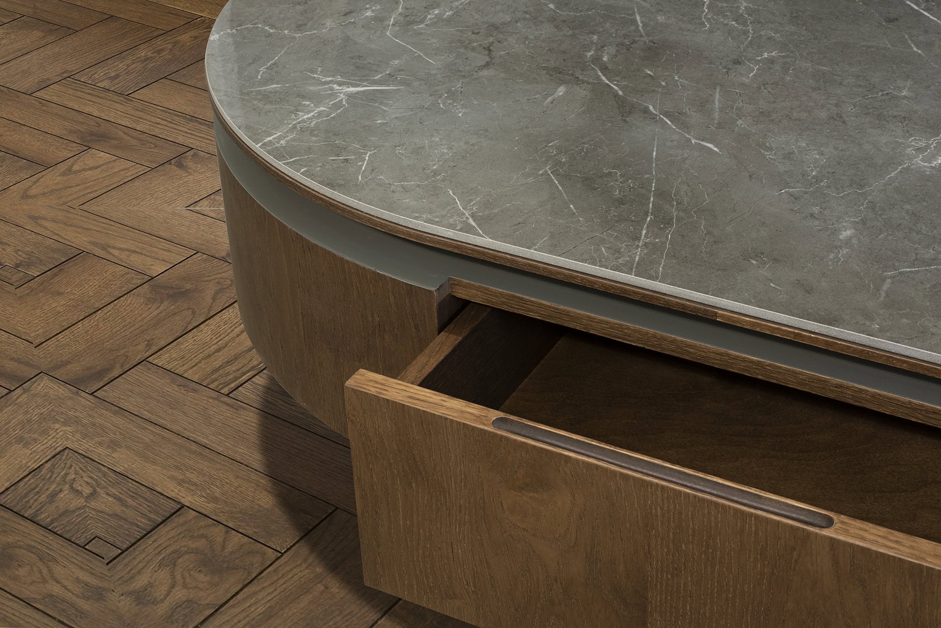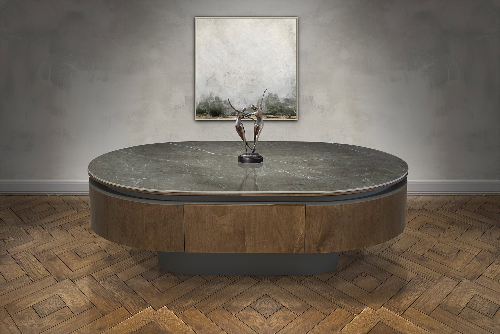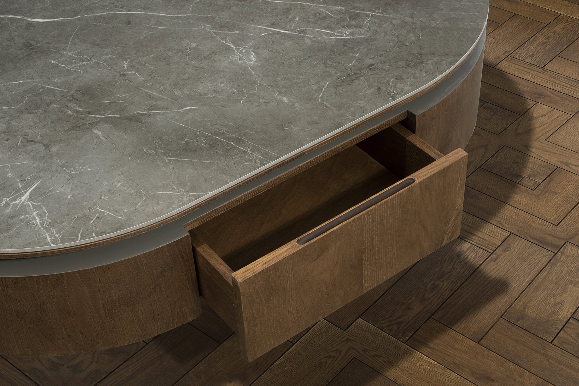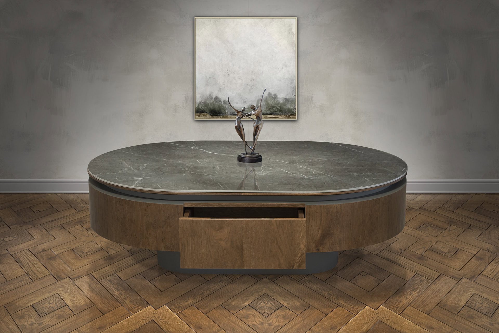 Τραπεζάκι σαλονιού σε σχήμα οβάλ,με ξύλο δρυ ρουστίκ και επιφάνεια κεραμική . Διαθέτει συρτάρι για αποθήκευση. Το τραπέζι σαλονιού N97 το κατασκευάζουμε σε χρώματα και υλικά της επιλογής σας.