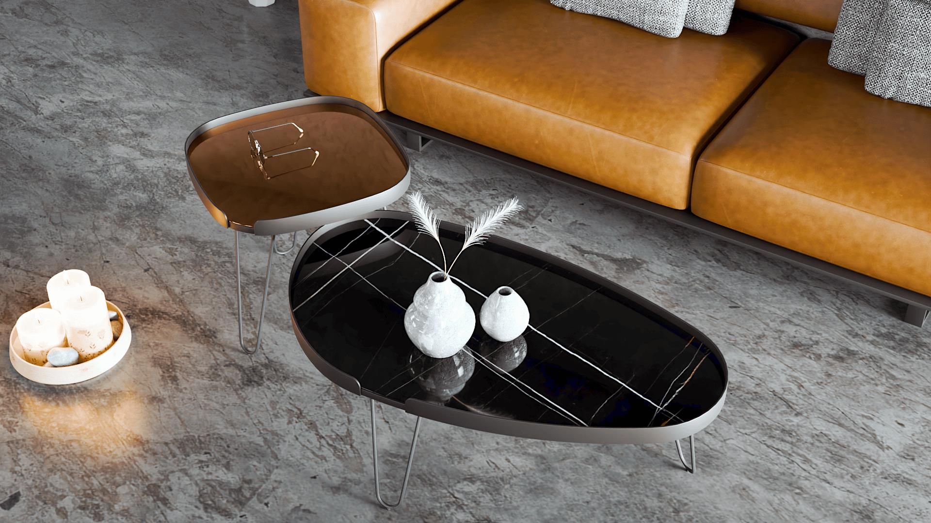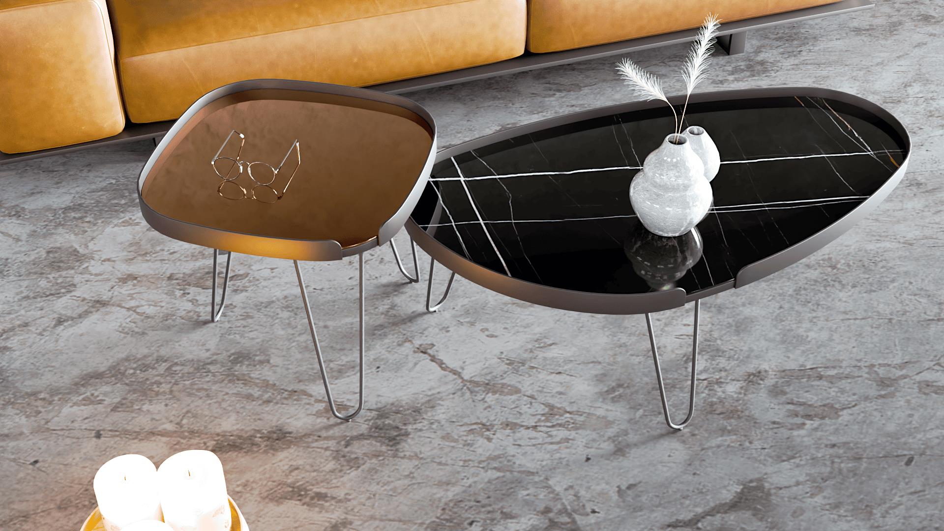 Ένα τραπέζι σαλονιού με ιδιαίτερο σχέδιο σε επιφάνεια ξύλου ή κεραμικού της επιλογή σας. Η βάση του τραπεζιου είναι από μέταλλο και βάφονται σε χρώματα λάκας. Μπορείτε να το συνδυάσετε προαιρετικά και με το μικρό βοηθητικό τραπεζάκι.
