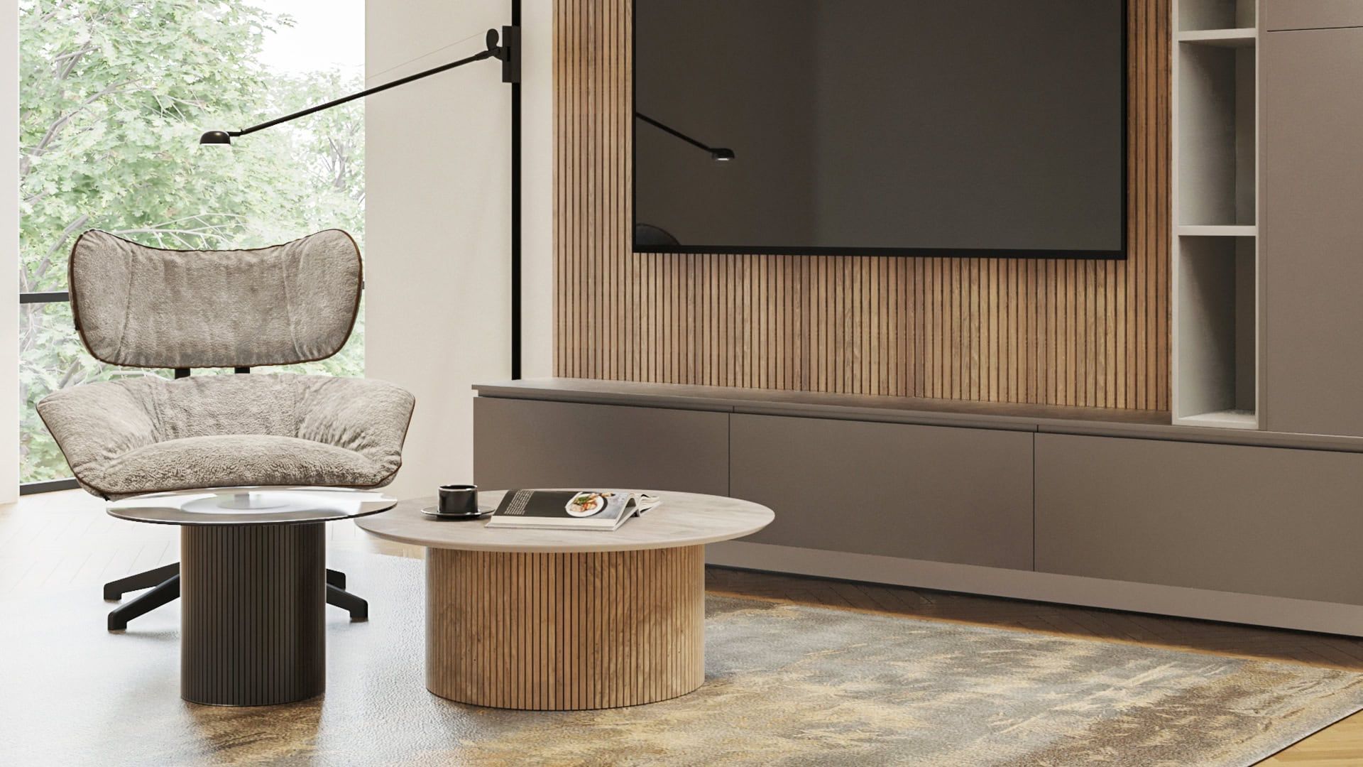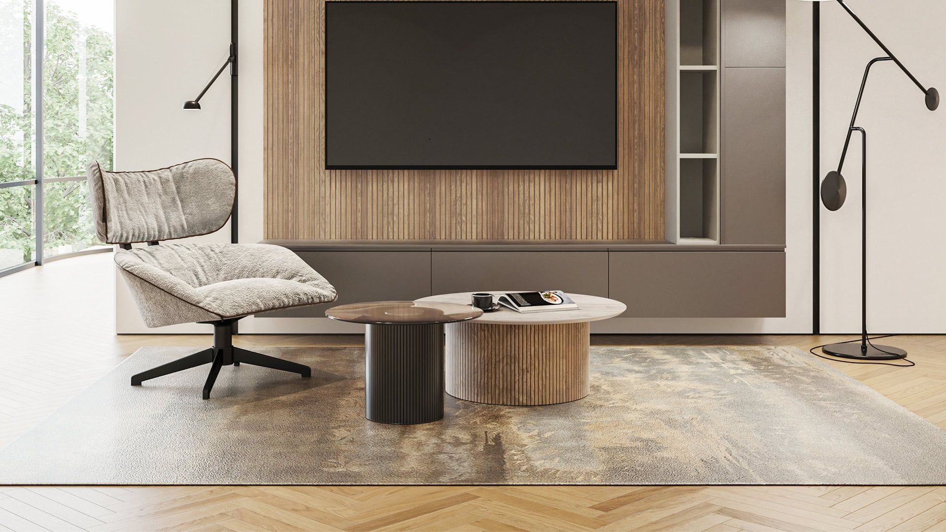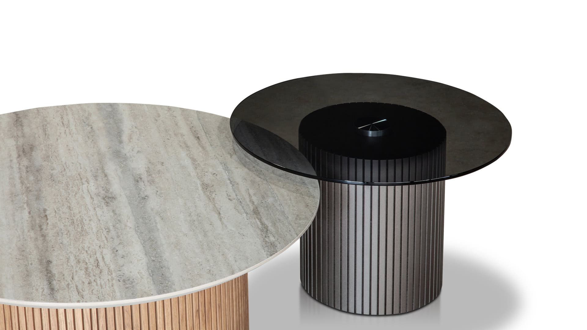 Το σετ Pluto αποτελείται από δύο στρογγυλά τραπεζάκια: το ένα με κεραμική επιφάνεια και το άλλο με φιμέ τζάμι, πλαισιωμένα από βάσεις σε panel δρυς και panel λάκας. Μια παιχνιδιάρικη αλλά κομψή σύνθεση που γεμίζει το σαλόνι με μοντέρνες πινελιές και ιδιαίτερο χαρακτήρα.