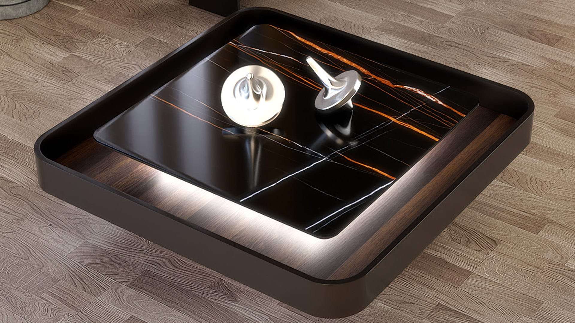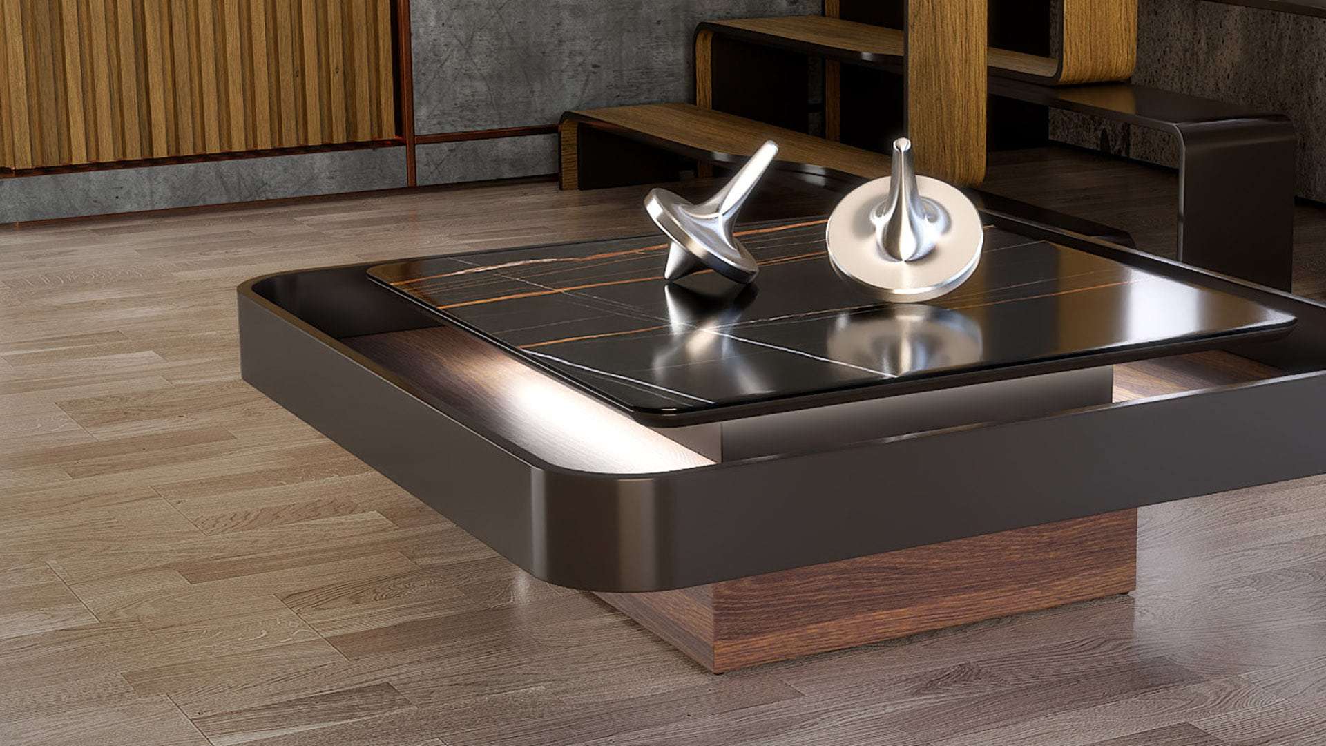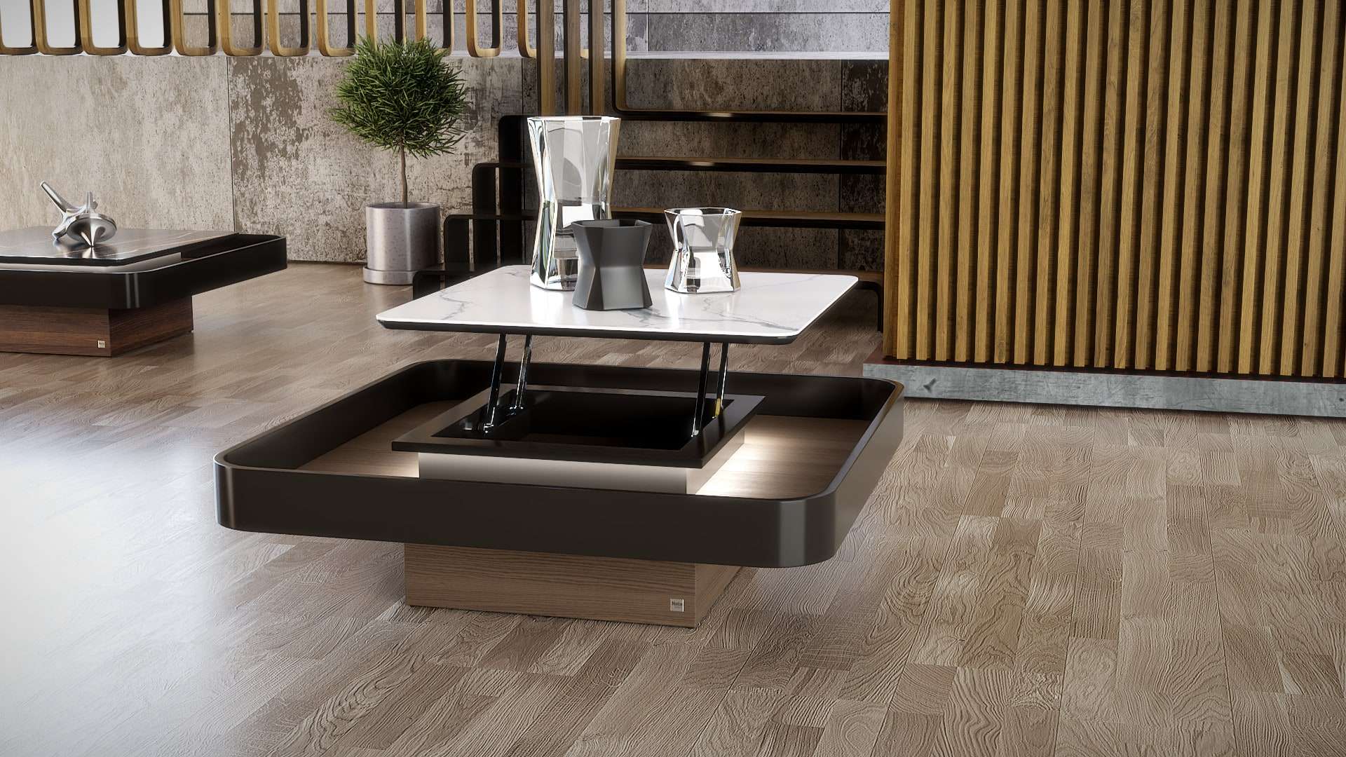 Κομψοτέχνημα μοναδικού σχεδιασμού που ξεχωρίζει στο χώρο και τραβάει τα βλέμματα. Εμπνευσμένο από τα νέα σχεδιαστικά πρότυπα με το συνδυασμό ξύλου ευκαλύπτου, λάκας και έντονων κεραμικών στοιχείων. Υψηλής ποιότητας υλικά, φινέτσα και λειτουργικότητα. Με εύχρηστο σερβιτόρο που εξυπηρετεί μεγάλη παρέα και προαιρετικά διακριτικό κρυφό φωτισμό για μοναδική ambient ατμόσφαιρα