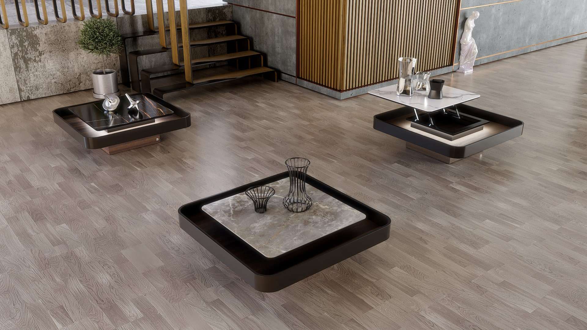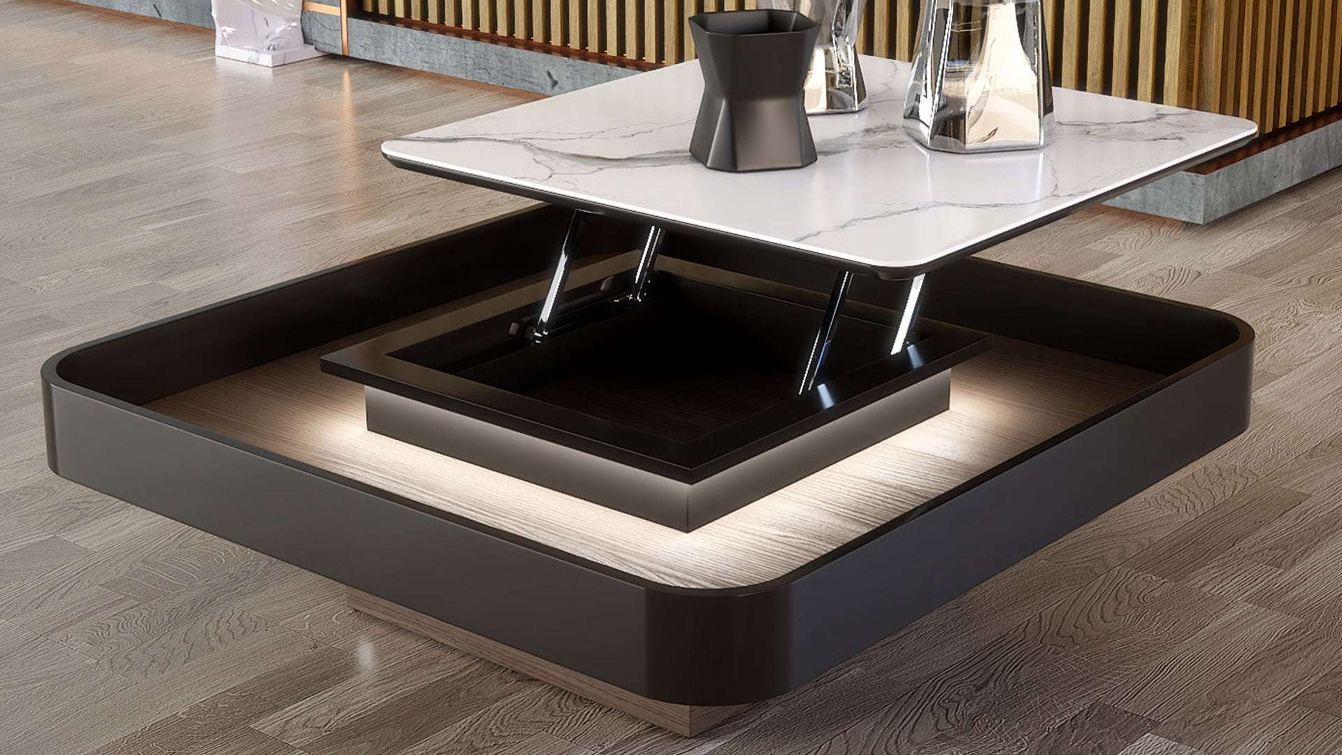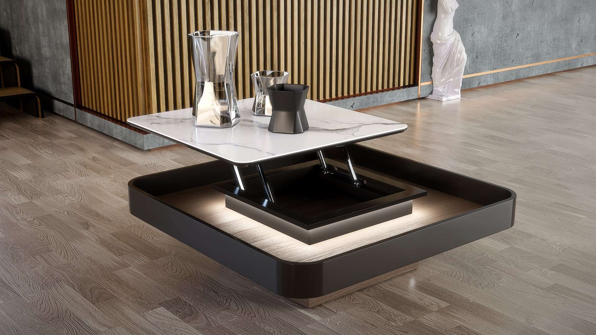 Κομψοτέχνημα μοναδικού σχεδιασμού που ξεχωρίζει στο χώρο και τραβάει τα βλέμματα. Εμπνευσμένο από τα νέα σχεδιαστικά πρότυπα με το συνδυασμό ξύλου ευκαλύπτου, λάκας και έντονων κεραμικών στοιχείων. Υψηλής ποιότητας υλικά, φινέτσα και λειτουργικότητα. Με εύχρηστο σερβιτόρο που εξυπηρετεί μεγάλη παρέα και προαιρετικά διακριτικό κρυφό φωτισμό για μοναδική ambient ατμόσφαιρα