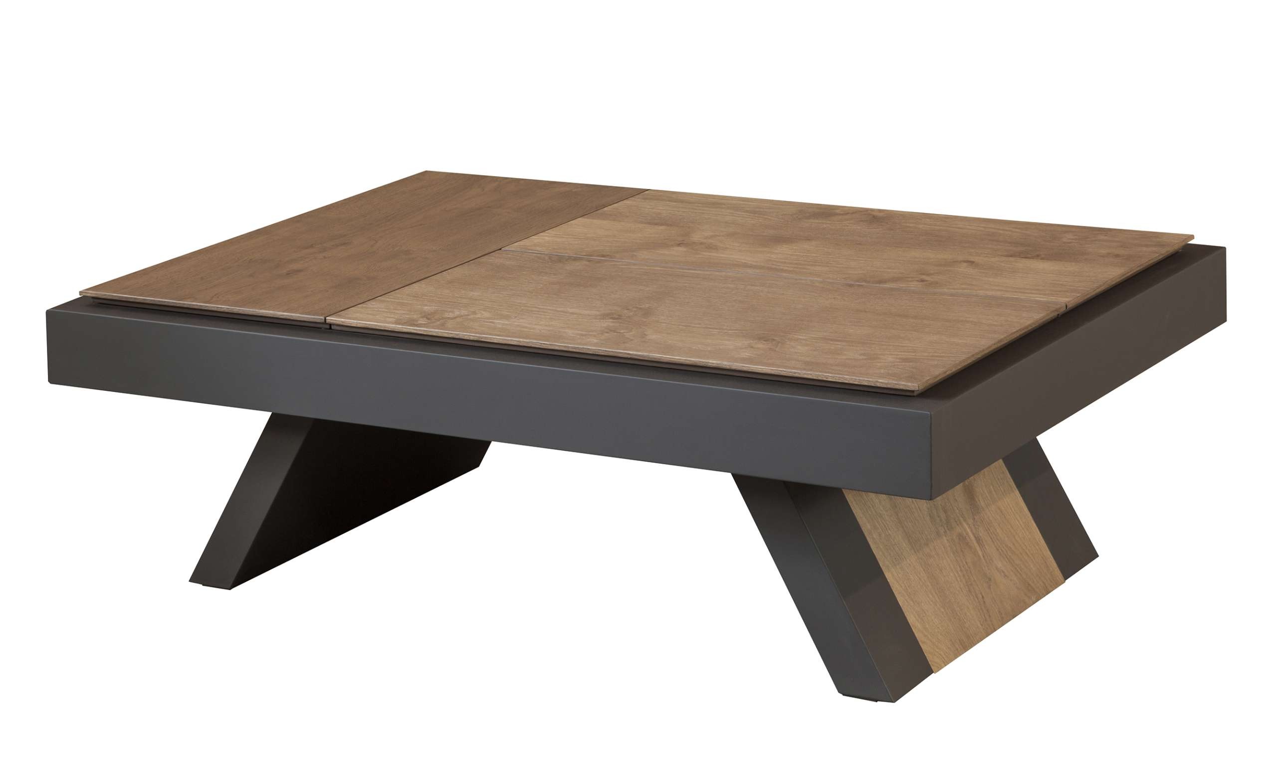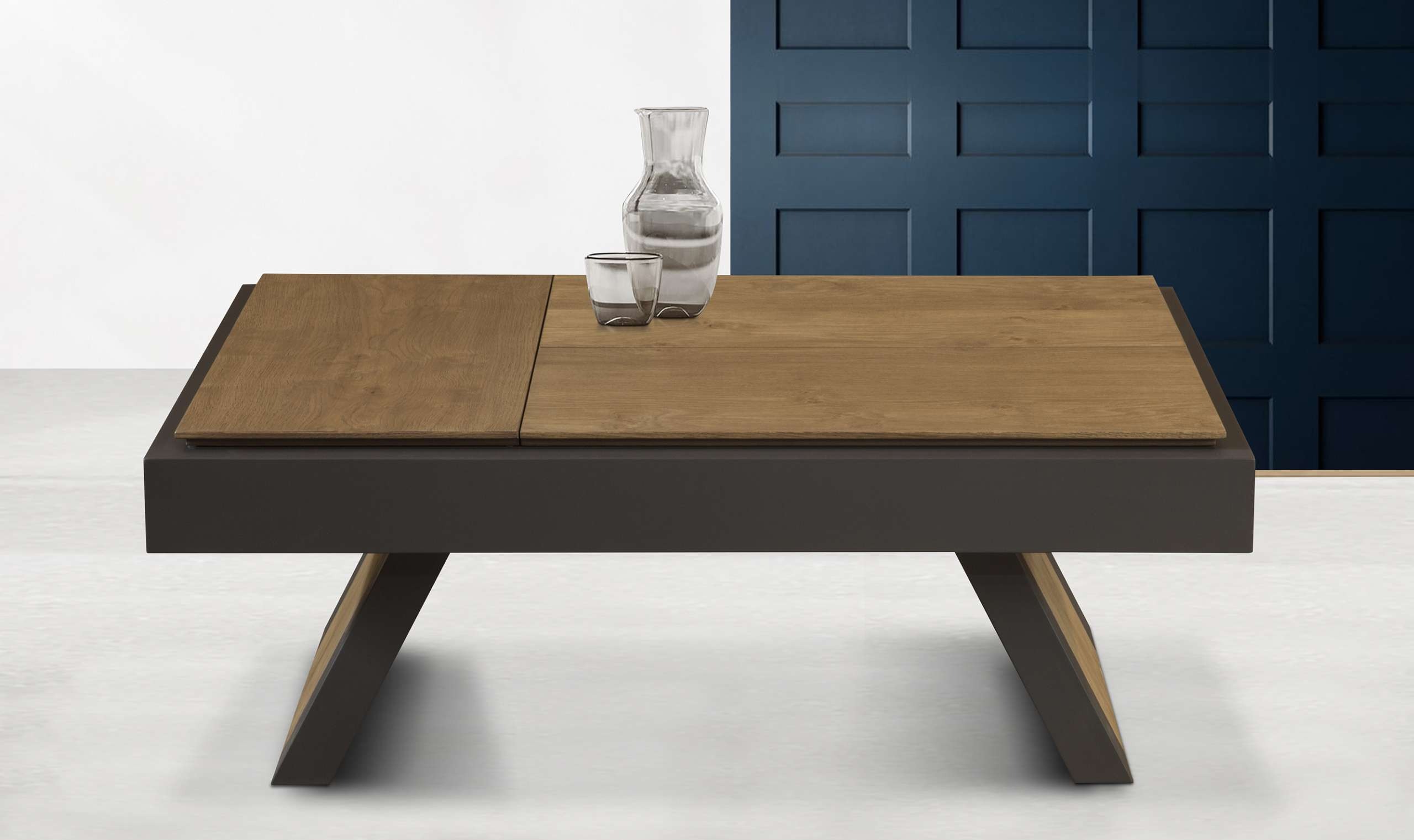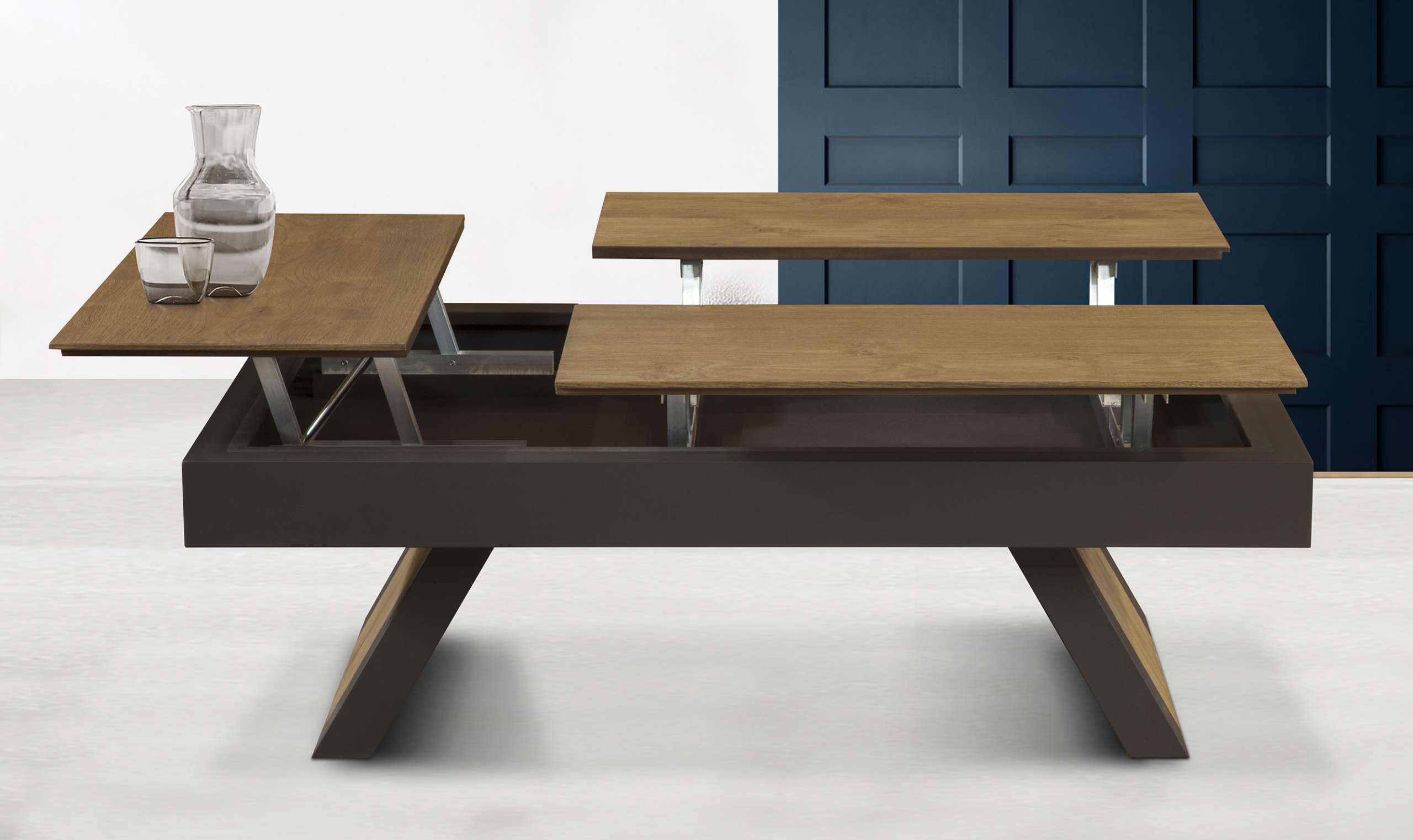 Τραπεζάκι σαλονιού με φυσικό ξύλο δρυς ρουστίκ και λάκα. Με τρεις μηχανισμούς σερβιτόρου και έξτρα αποθηκευτικό χώρο.