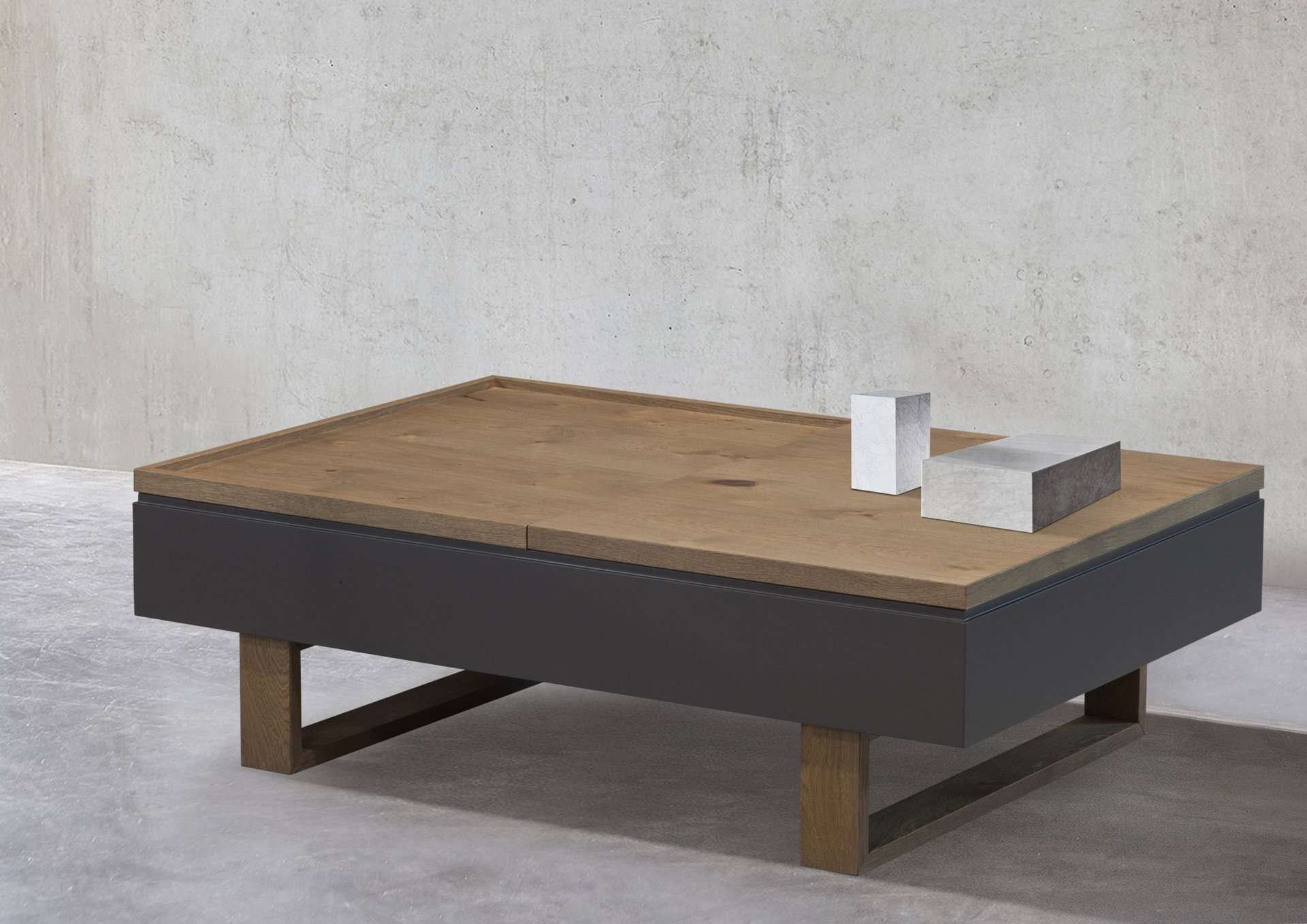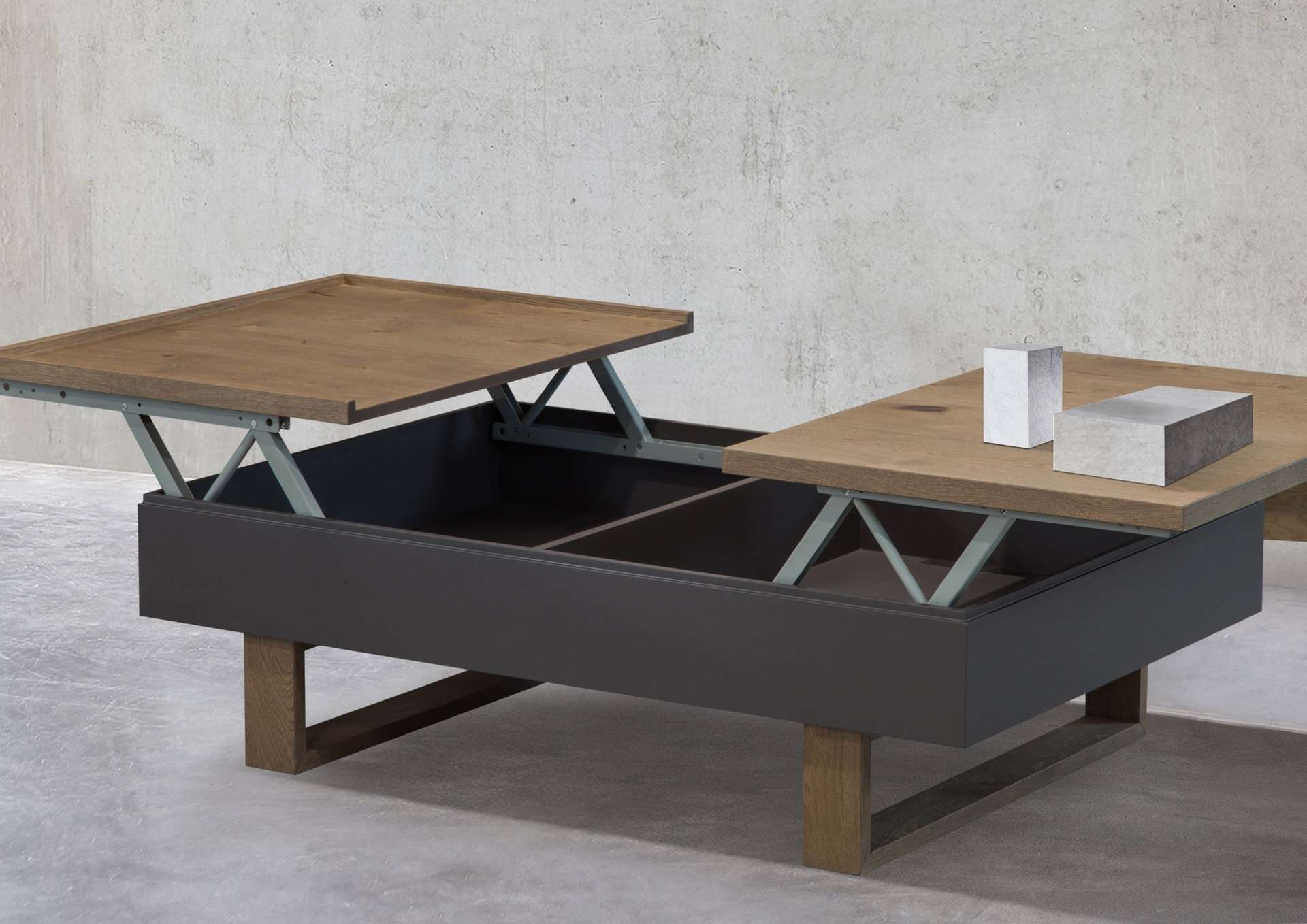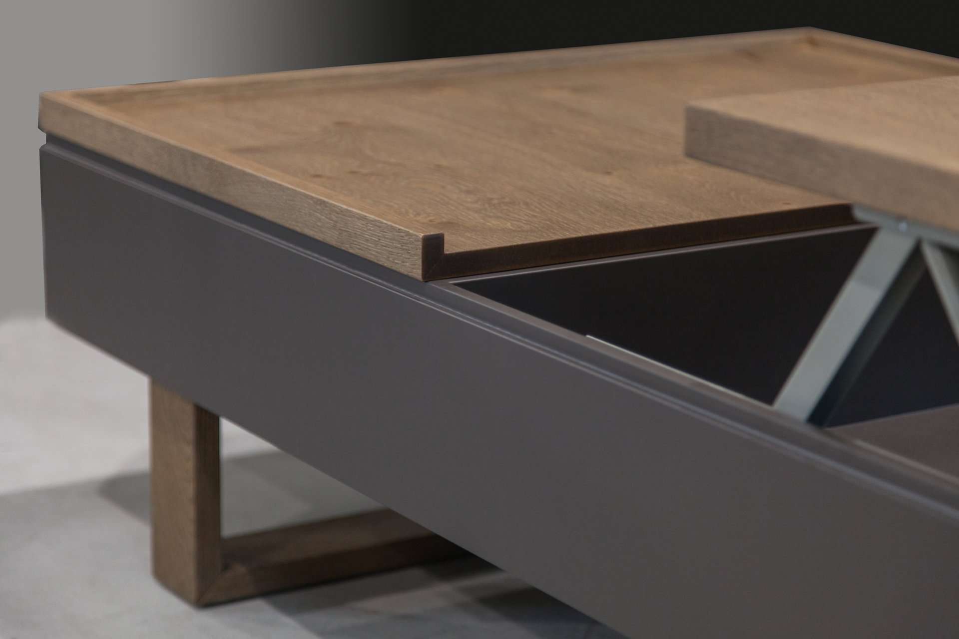 Τραπεζάκι σαλονιού με φυσικό ξύλο δρυς ρουστίκ και λάκα. Με δύο μηχανισμούς σερβιτόρου και έξτρα αποθηκευτικό χώρο.