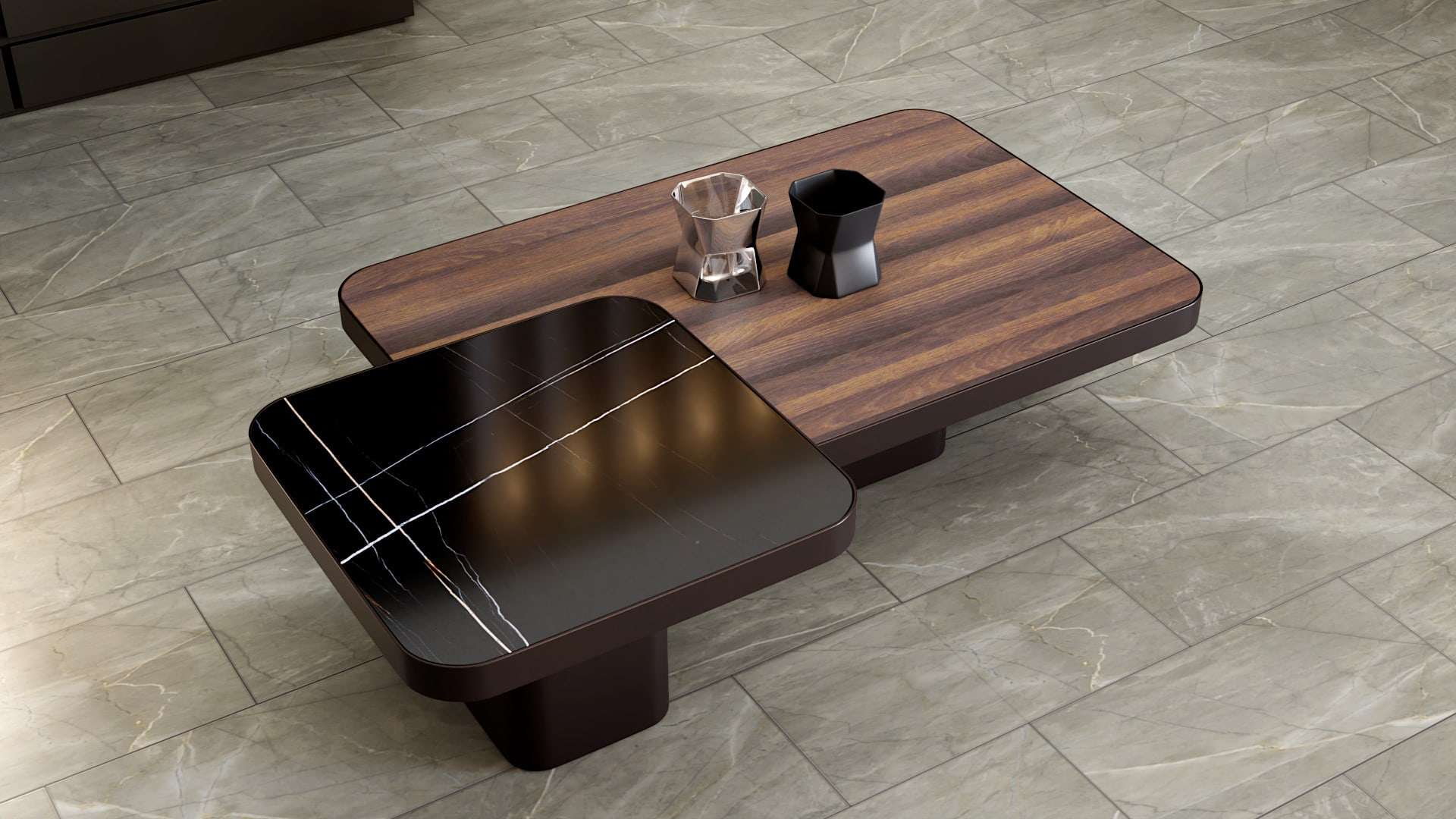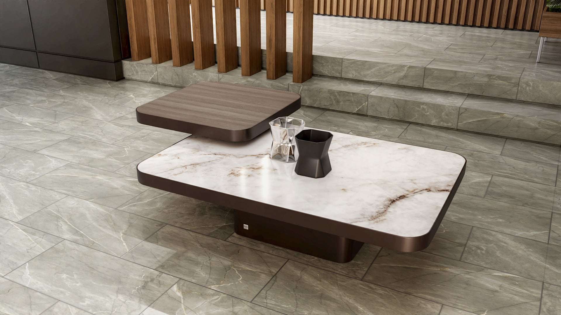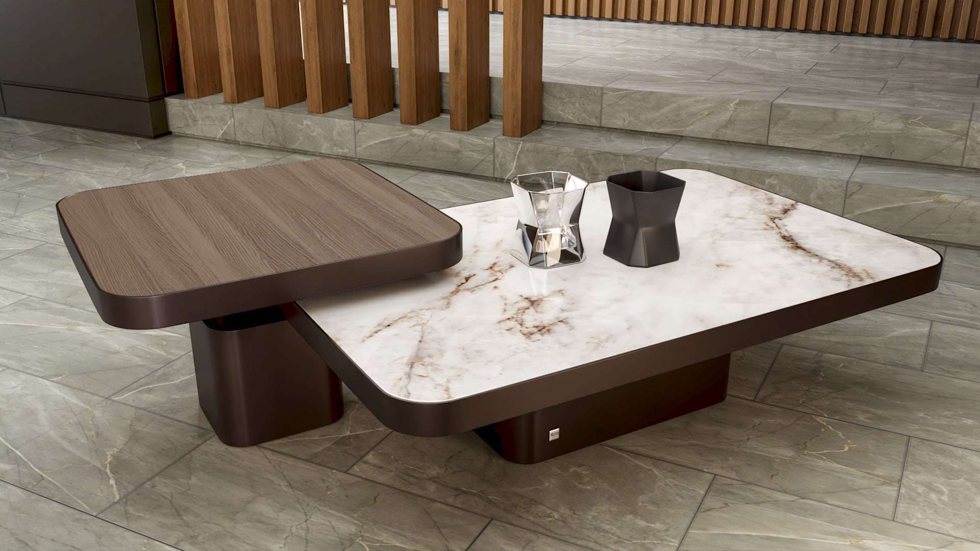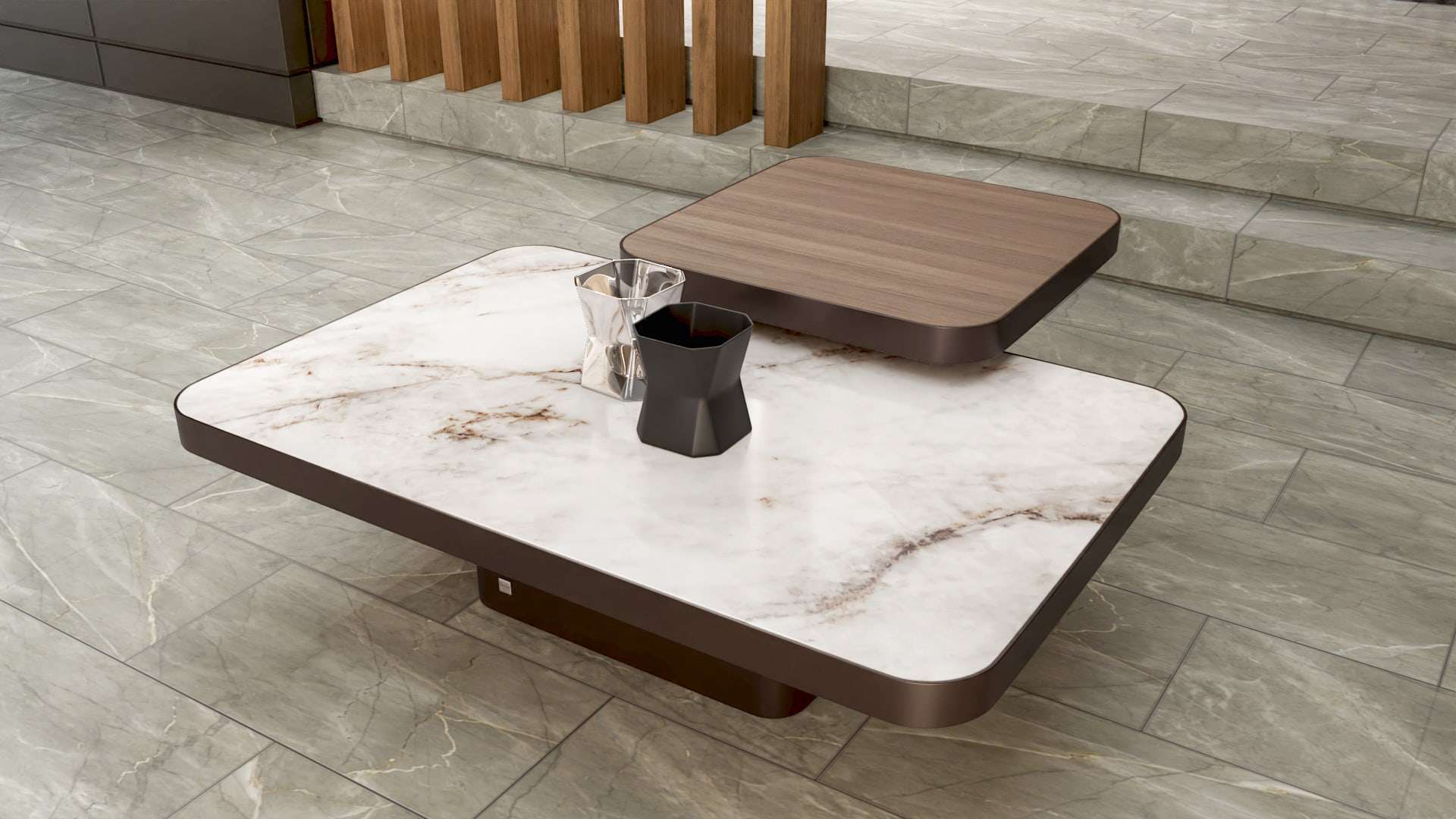 Ένα ιδιαίτερο τραπέζι σαλονιού παραλληλόγραμμο με ξύλο ευκαλύπτου ή δρυς και την προαιρετική επιλογή για κεραμικό. Η βάση του τραπεζιου είναι από λάκα με νέας τεχνολογίας βαφή που προσομοιάζει με μέταλλο. Μπορείτε να το συνδυάσετε προαιρετικά και με το μικρό βοηθητικό τραπεζάκι.